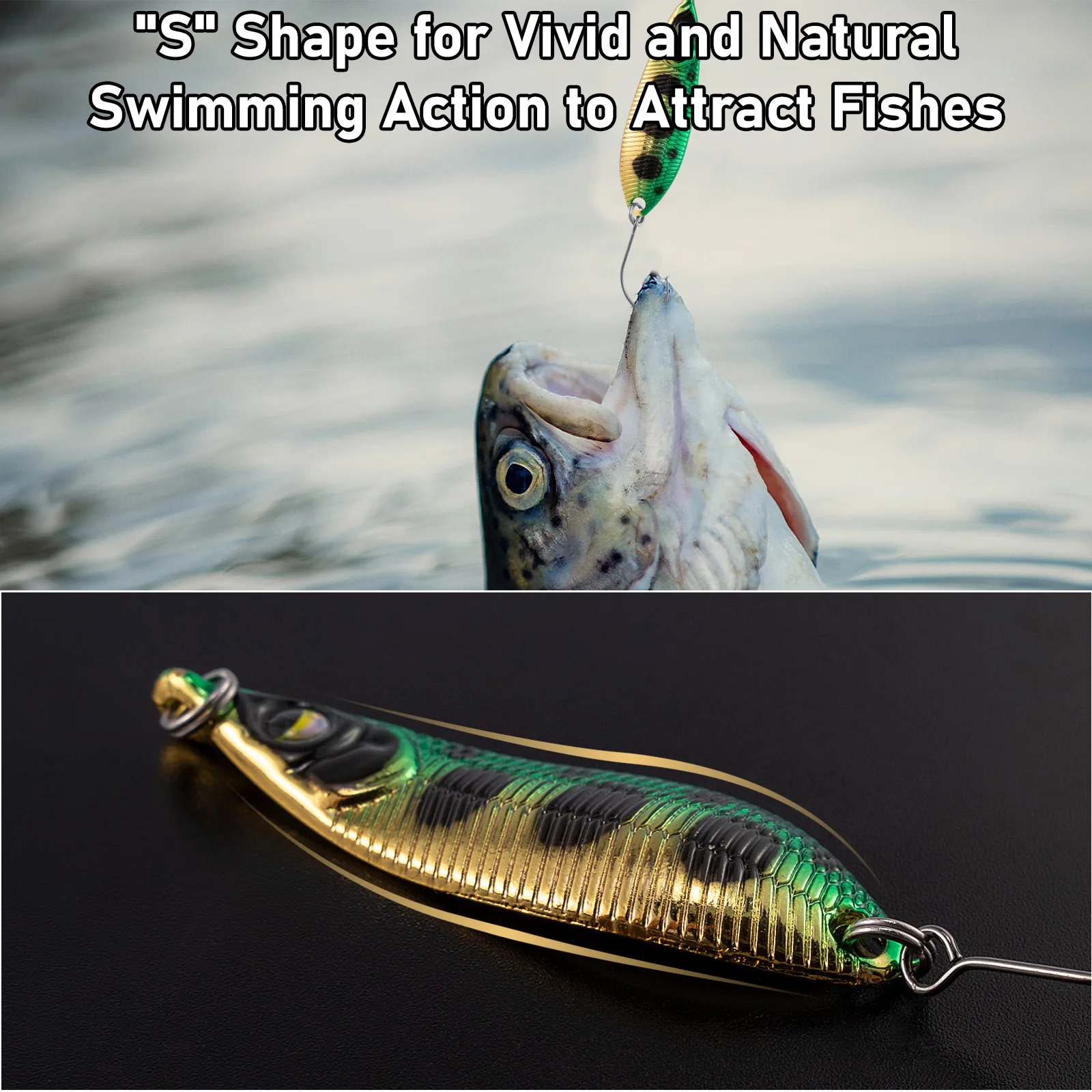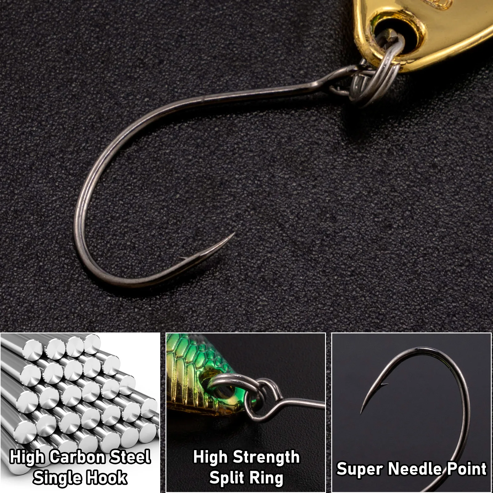Señuelos de cuchara de pesca premium: nuestras cucharas están hechas con material de alta calidad con recubrimiento galvanizado, armado con anillos divididos de alambre hiper. La tecnología de corte mecanizado preciso los hace irrompibles, no flexibles y resistentes a la corrosión.