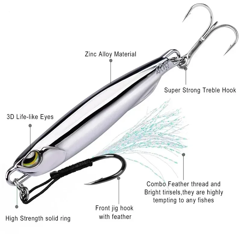 • Placa de hierro galvanizado: la placa de hierro galvanizado garantiza la durabilidad y la longevidad, por lo que es una opción confiable para los pescadores.• Cebo biomimético: el diseño del cebo biomimético imita la apariencia de los peces reales, lo que lo hace atractivo para los peces y aumenta las posibilidades de atraparlos.• Cebo duro: el diseño del cebo duro permite una mayor penetración en el agua, haciéndolo efectivo en aguas más profundas donde es más probable que se encuentren peces.• 2 Anzuelos: con dos anzuelos, es más probable que este señuelo atrape peces, ya que aumenta las posibilidades de engancharlos tanto en la línea superior como en la inferior.Característica:Adecuado para especies de peces feroces como el agua dulce y el agua de mar, como la lubina, el pez negro y el puchero. Al arrastrar, se balancea hacia la izquierda y hacia la derecha en el agua, con una fuerte simulación.Especificaciones:Peso: 15g/20g/30g/40gColores: plataPaquete incluido2 Señuelos de Pesca de 2 *Aviso:1. Debido a la toma y visualización, habrá diferencia de color entre el objeto y la imagen.2. Debido a los problemas de medición manual y producción por lotes, habrá ligeras diferencias en tamaño y peso.3. El anzuelo es Muy afilado, así que tenga cuidado al usarlo y póngalo fuera del alcance de los niños cuando lo guarde.