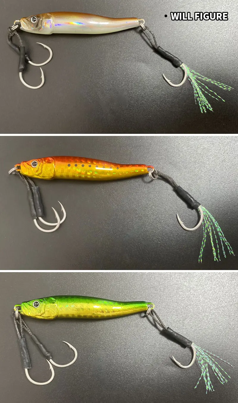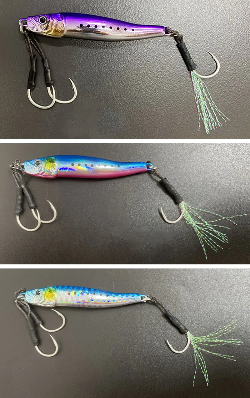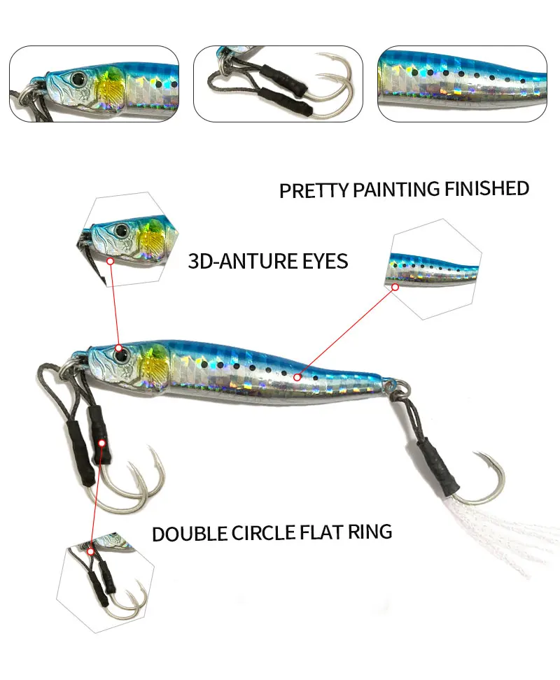 2. ¡La Plantilla de aguja es la imitación de metal perfecta de un pez aguja! El cuerpo largo y delgado emitirá una milla y tendrá muy poca resistencia en el agua. El perfil geométrico hace que el señuelo brille y parpadee al caer, deslizándose y rodando lejos de la línea de recuperación, enviando destellos y vibraciones en un patrón de movimiento muy errático. El cuerpo tiene un sonajero de acero incorporado, que envía un fuerte clic al jigging, atrayendo peces depredadores desde la distancia. La Plantilla de agujas tiene acción híbrida y se puede utilizar perfectamente para Jigging vertical, Shore Jigging, Cast Jigging y Slow Jigging.