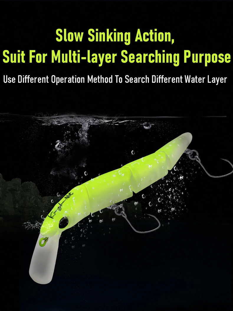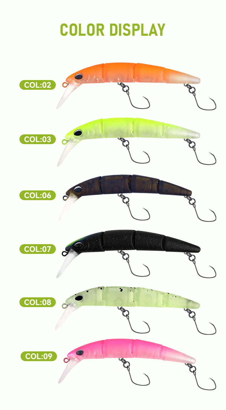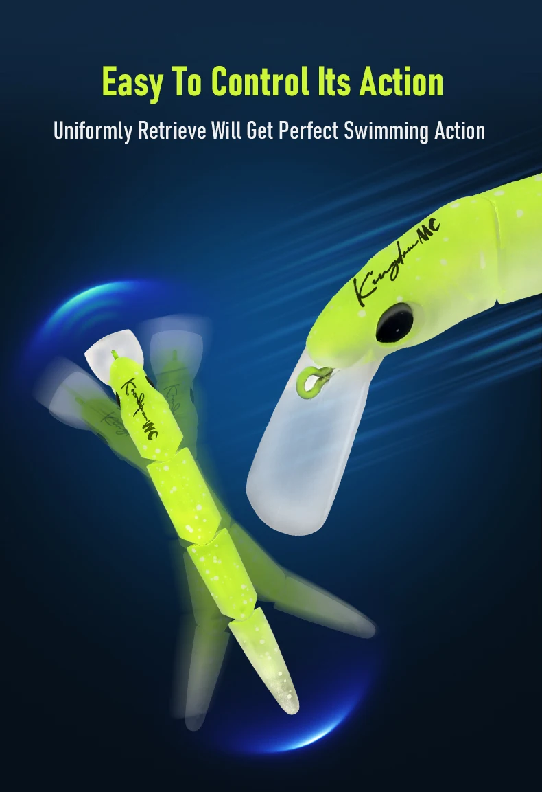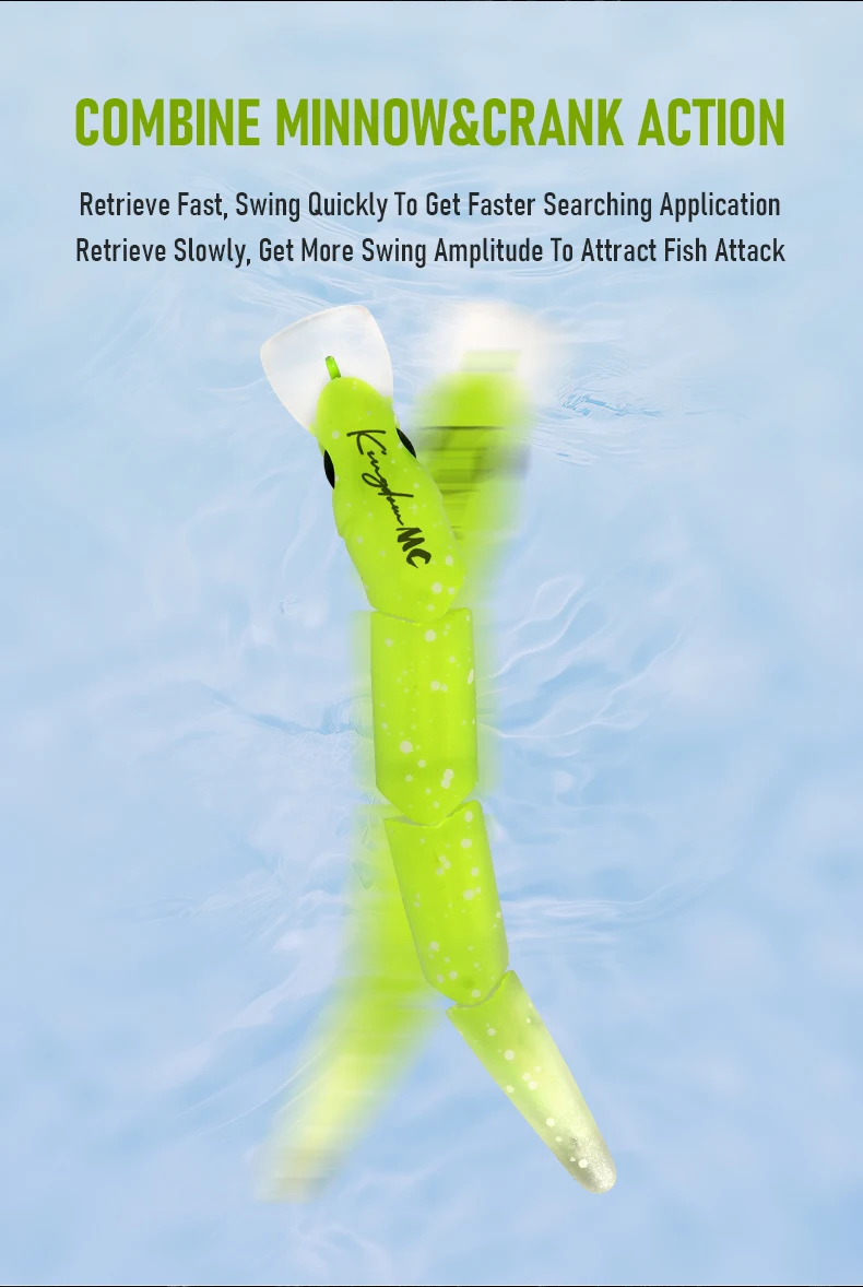 Minnow multiarticulado, está hecho de cuatro segmentos interconectados.Este diseño multiarticulado es el motor por su acción.