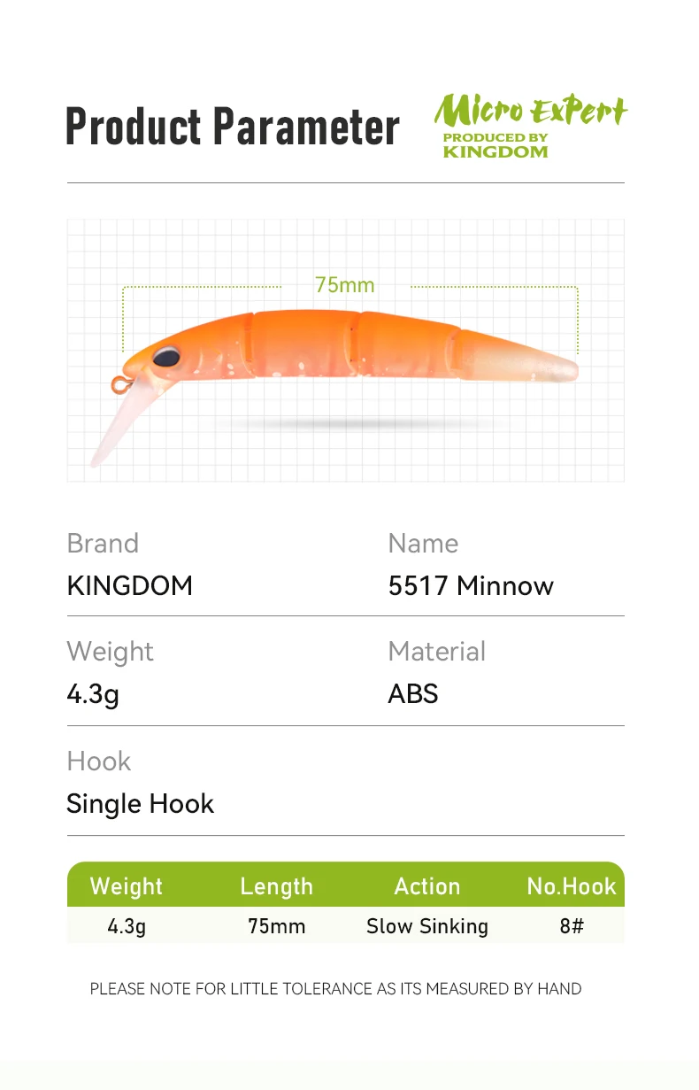 Kingdom-señuelo articulado Minnow, 70mm, 4,3g, hundimiento, 4 secciones, Wobbers duros, cebo Artificial para pesca de trucha y lubina de agua dulce