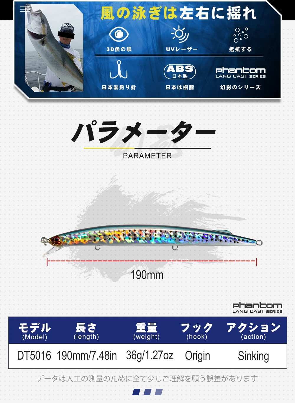 D1 Fishing Minnow 190 mm (36 g): jerkbait que se hunde para lubinas y truchas. Lanza lejos, sacude de forma errática, se sumerge entre 0.6 y 0.9 metros. Ganchos resistentes, ABS duradero, excelente relación calidad-precio (~$12). Letal con recogida constante o pausa de movimiento brusco. Señuelo sólido y económico para pesca de curricán o casting.