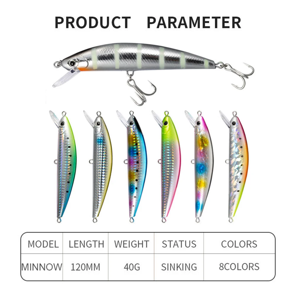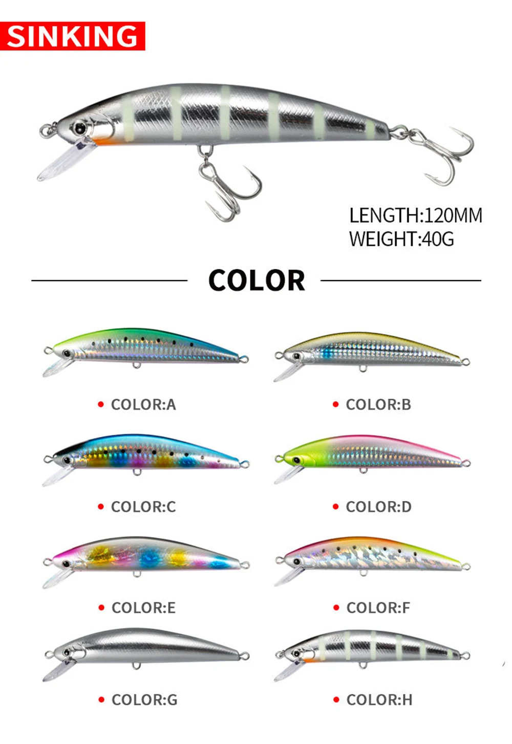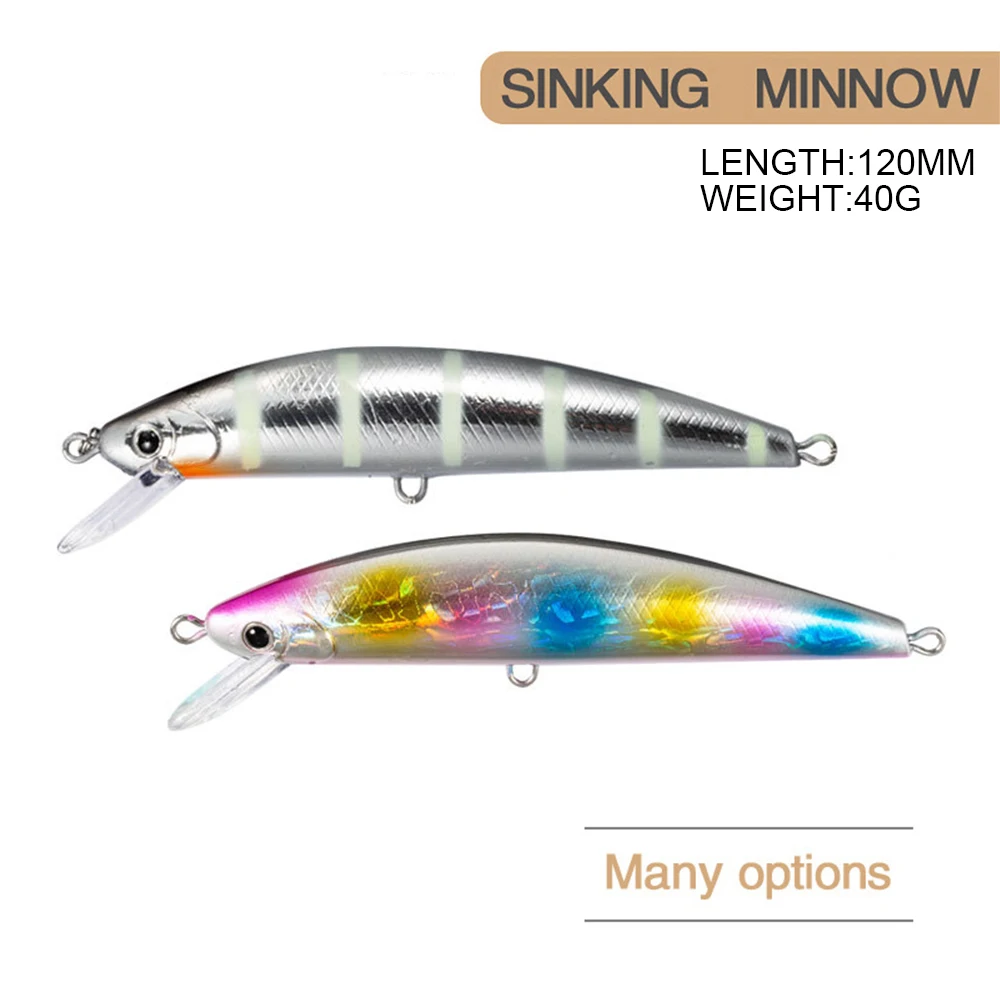 12cm 40g señuelo de pesca Minnow Wobbler de fundición larga hundimiento Jerkbait Swimbait cebo duro Artificial pesca en el océano cebo de lubina señuelo falso