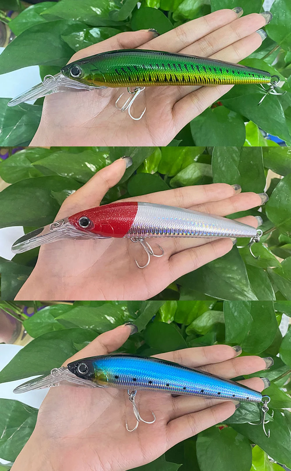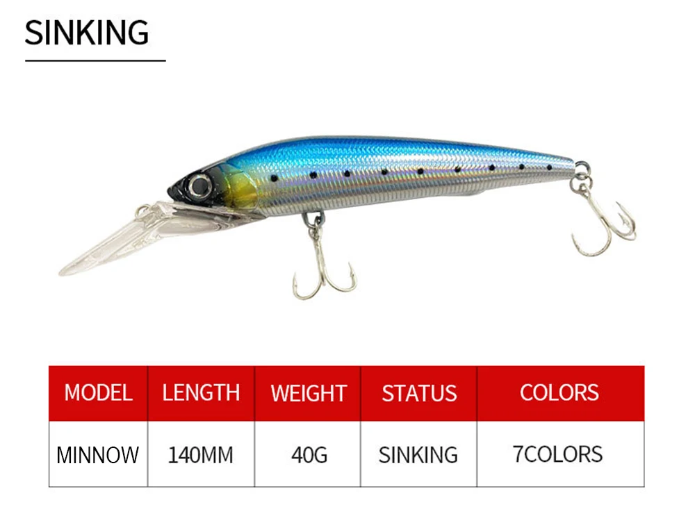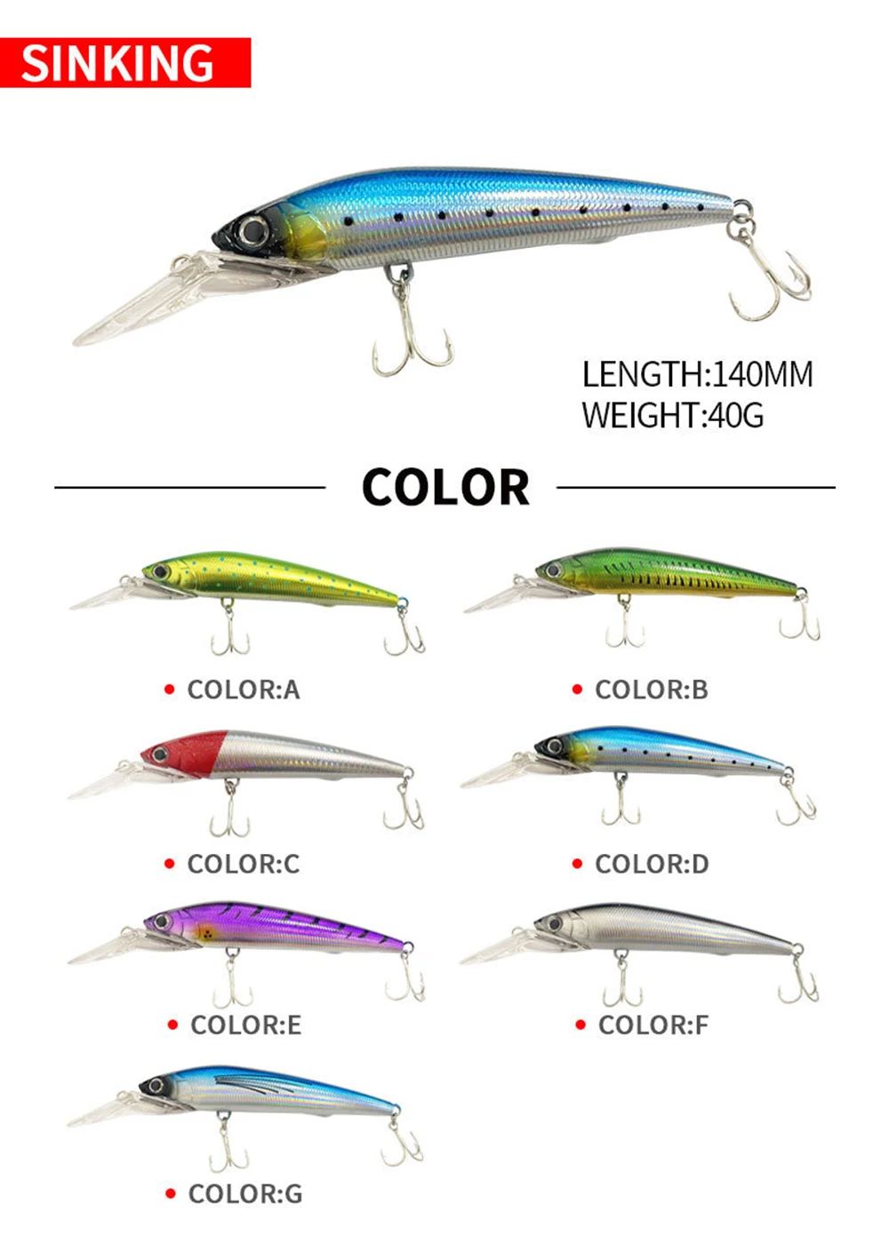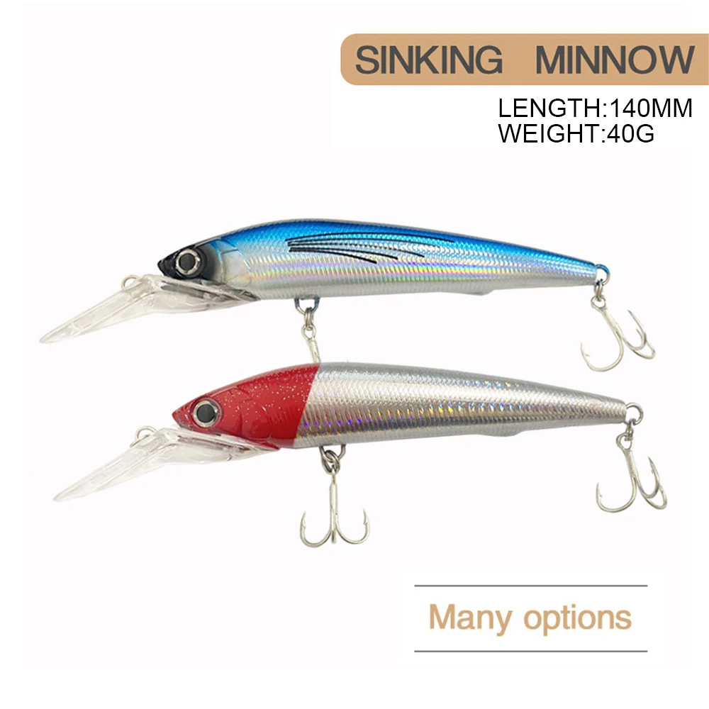 Señuelo de pesca de 14cm y 40g, señuelo de pesca Minnow Wobbler de fundición larga, Jerkbait de hundimiento, barco de pesca en el océano profundo, cebo duro Artificial, señuelo falso de lubina