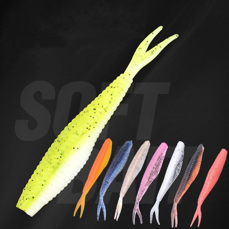 Señuelo de pesca 20 piezas, cebo blando de 1,5g y 7cm con cola bifurcada, gusano de pesca, laca de doble Color, de silicona suave
