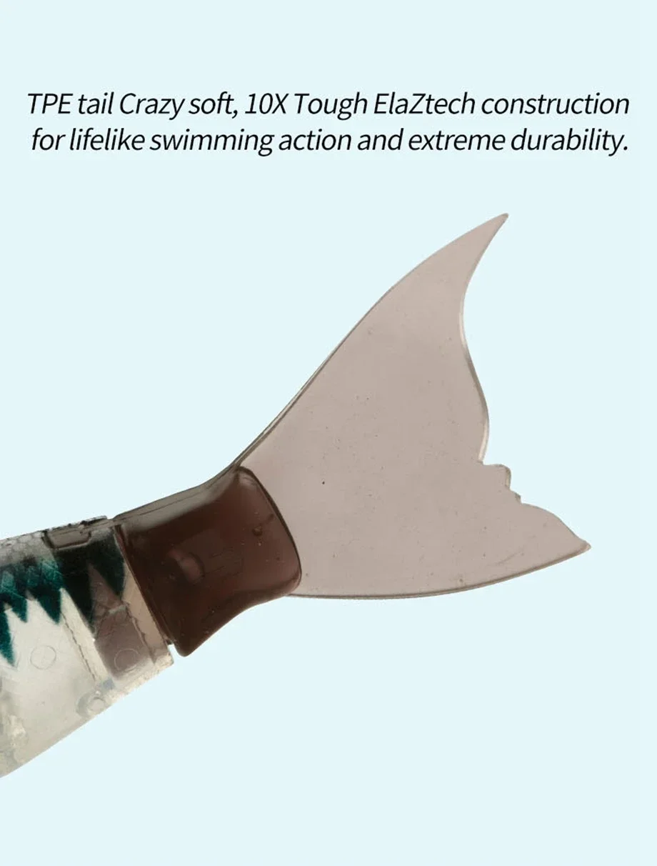 * Cola de TPE Construcción ElaZtech suave y resistente 10X para una acción de natación realista y una durabilidad extrema.