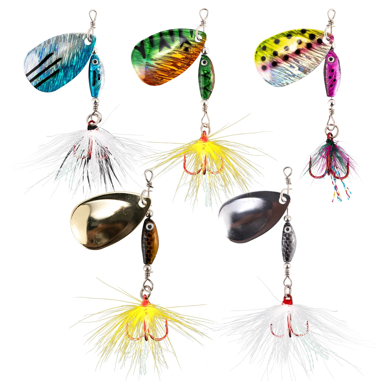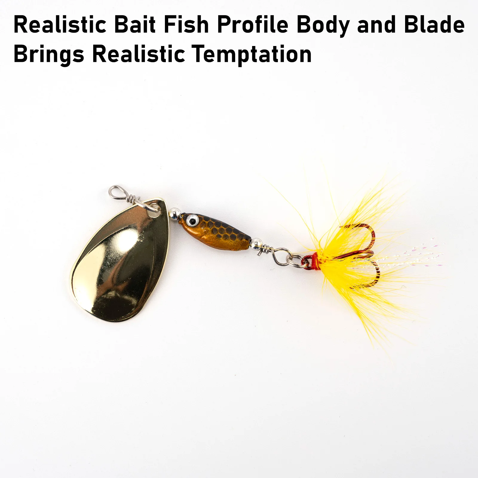 Señuelo giratorio con un anzuelo triple de acero con alto contenido de carbono y afilado y pegajoso con cola de plumas para agregar una acción fluida bajo el agua, se dirige a la mayoría de los peces como trucha, lubina, tipo de pez y bluegill.