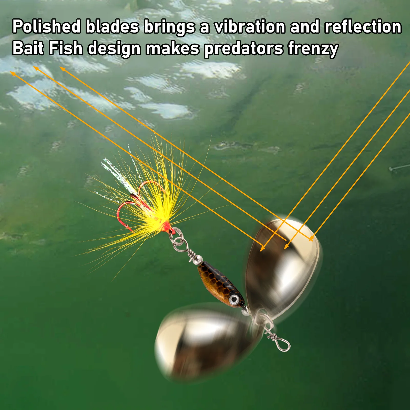 Este señuelo de pesca está equipado con una vívida hoja giratoria con perfil de pez cebo, alambre de acero inoxidable resistente a la corrosión, anzuelo triple y una cola emplumada para una apariencia realista, lo que lo convierte en una poderosa herramienta de pesca.