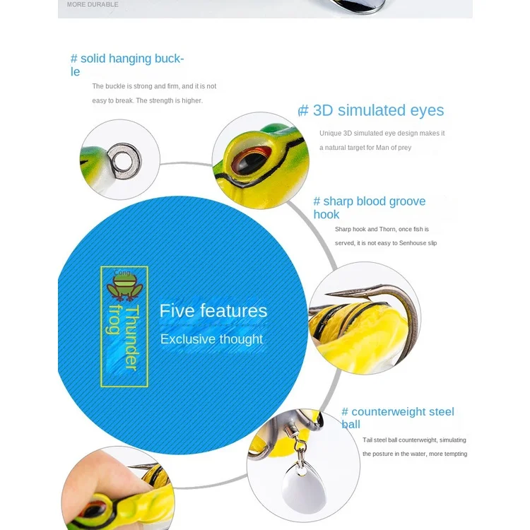 1.El cuerpo de la rana adopta tecnología de recubrimiento multicapa, material de goma, que es más suave, y el diseño de ojo de rana 3D es llamativo y realista, lo cual es muy atractivo para el pez objetivo.