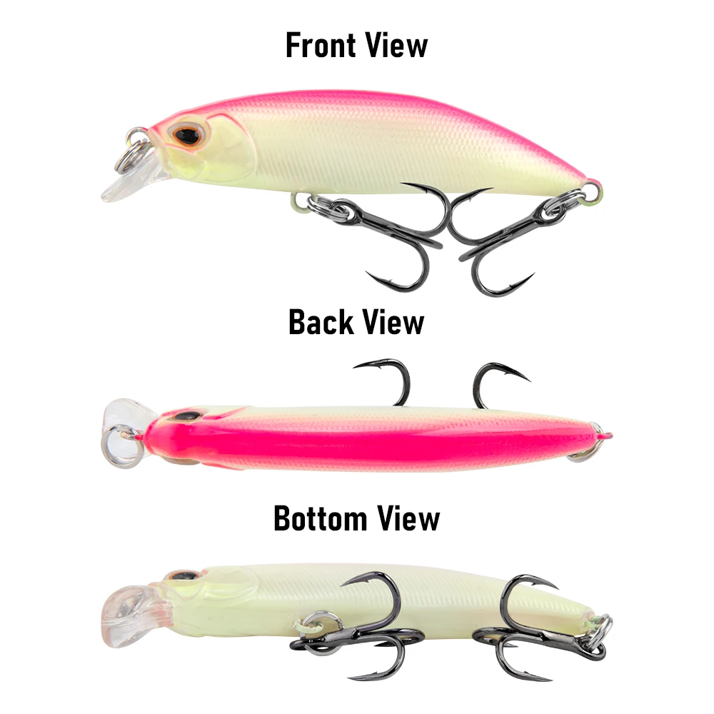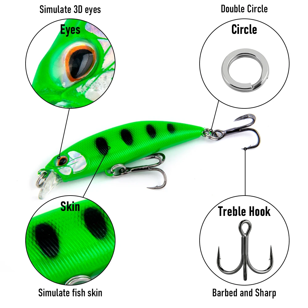- Los patrones corporales brillantes de alta resolución con globos oculares simulados en 3D pueden confundir y provocar depredadores. Nade con una atractiva acción oscilante que aumenta la tasa de golpes.