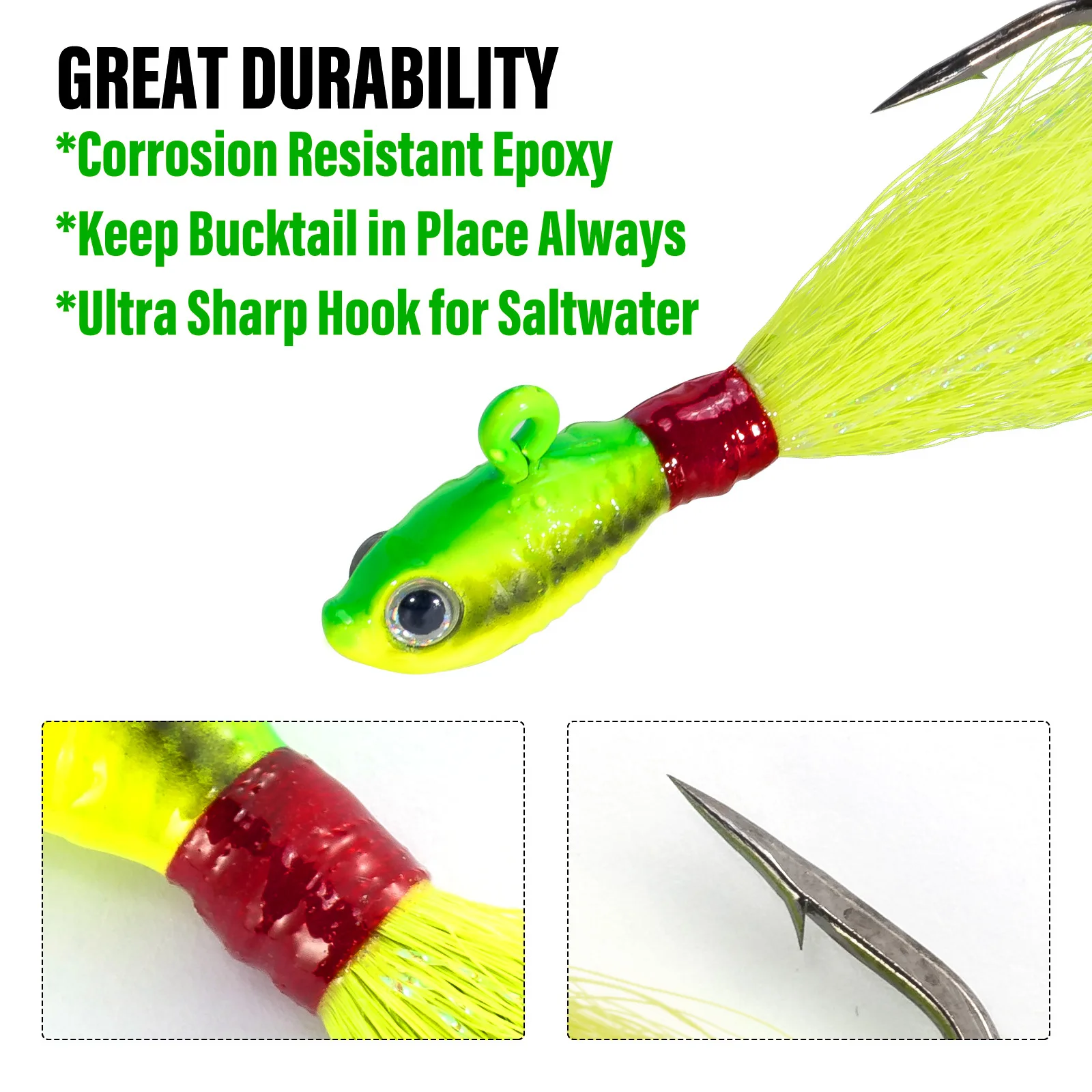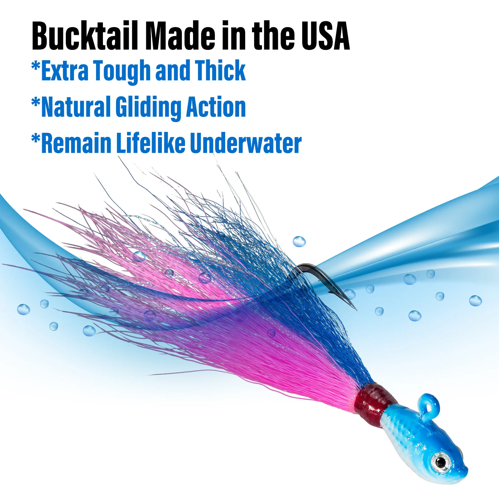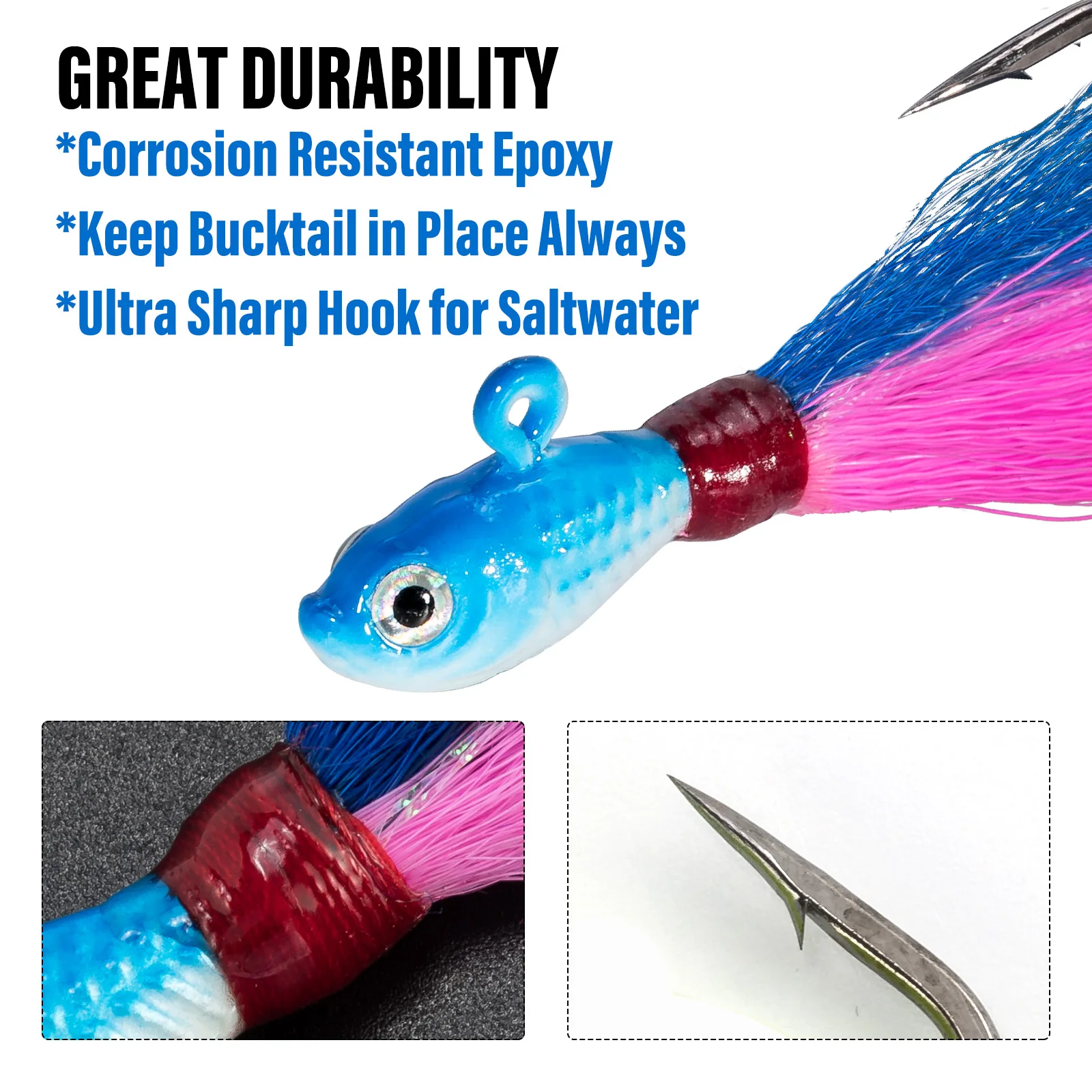 Puede aterrizar lubina rayada, pez azul, lucioperca, perca blanca, pez Roca y muchos otros tipos de especies de agua salada con jigs bucktail. Los increíbles señuelos te brindan una gran cosecha donde sea que pesques, como playas de arena abierta, costa rocosa, agua salada profunda. El diseño selectivo y la artesanía hacen que este señuelo cobre vida y maximice la tasa de captura.