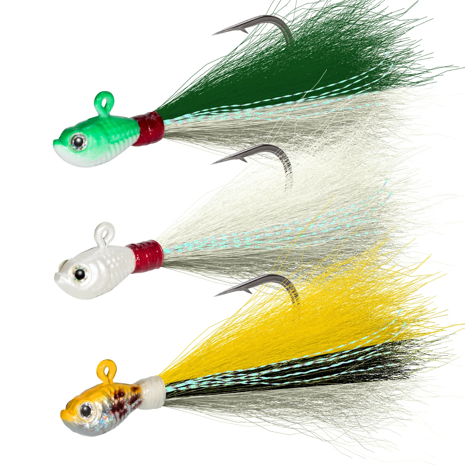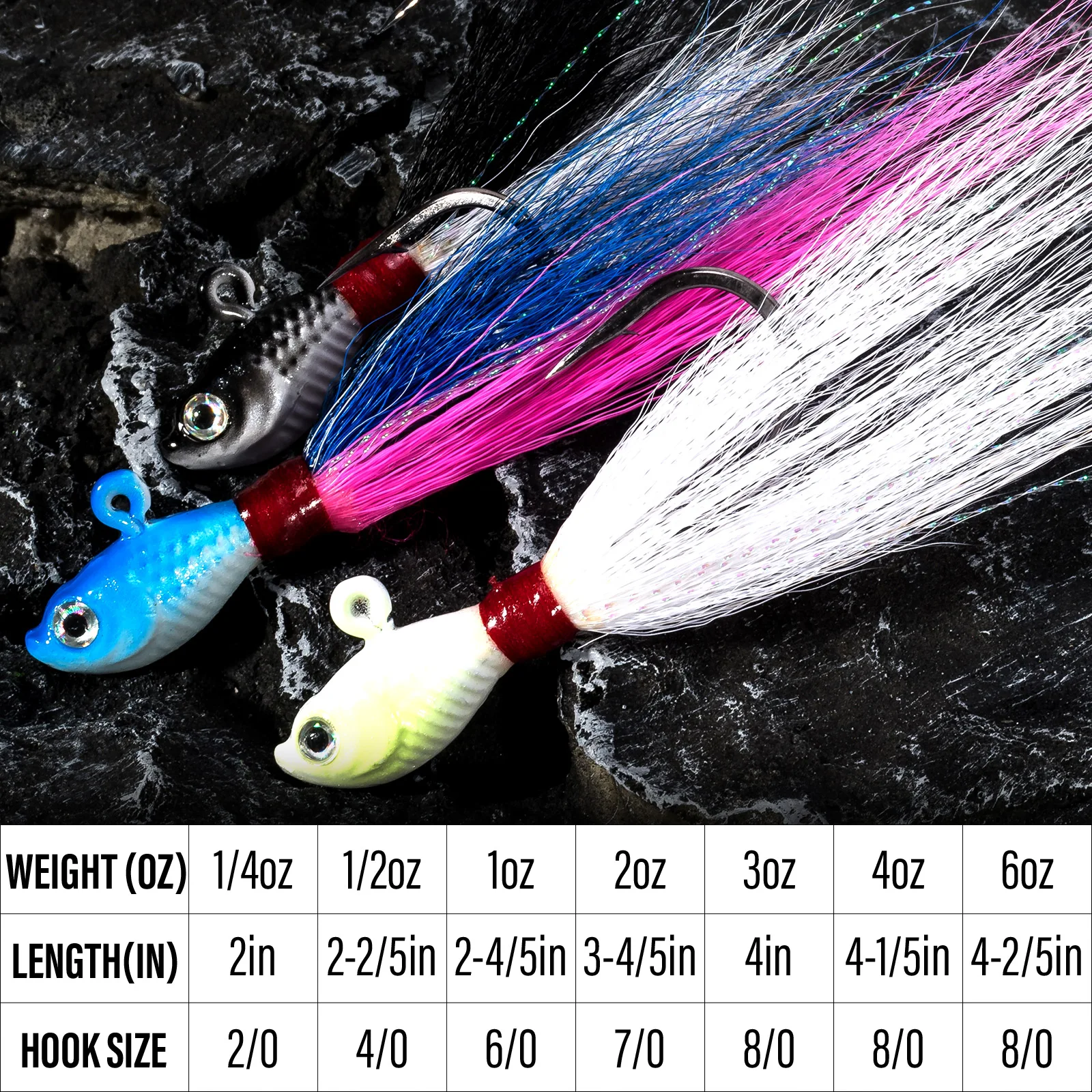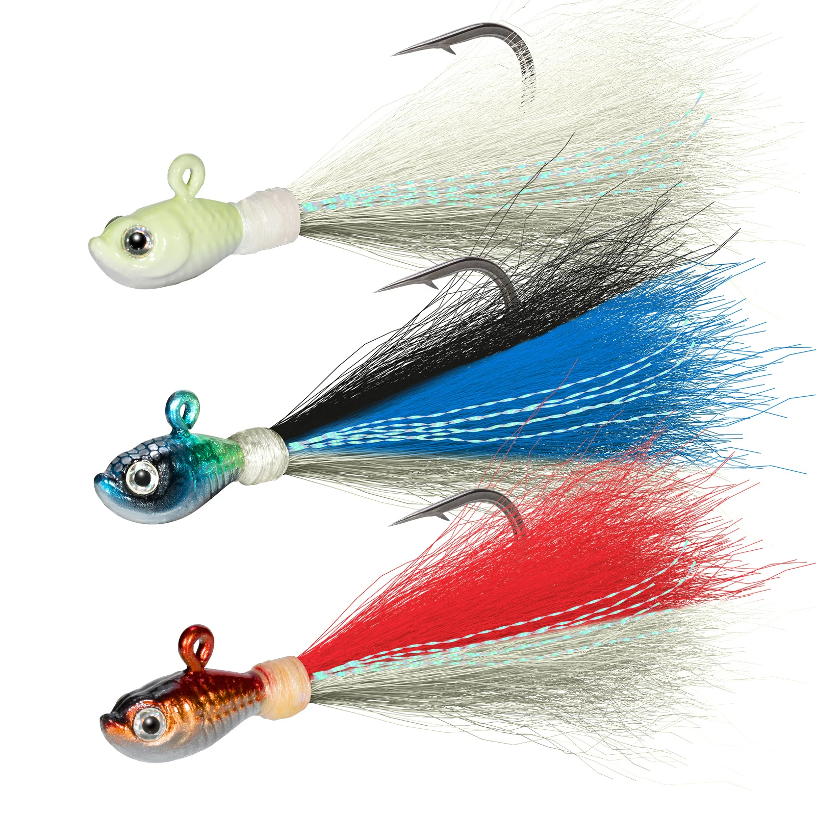 Puede aterrizar lubina rayada, pez azul, lucioperca, perca blanca, pez Roca y muchos otros tipos de especies de agua salada con jigs bucktail. Los increíbles señuelos te brindan una gran cosecha donde sea que pesques, como playas de arena abierta, costa rocosa, agua salada profunda. El diseño selectivo y la artesanía hacen que este señuelo cobre vida y maximice la tasa de captura.