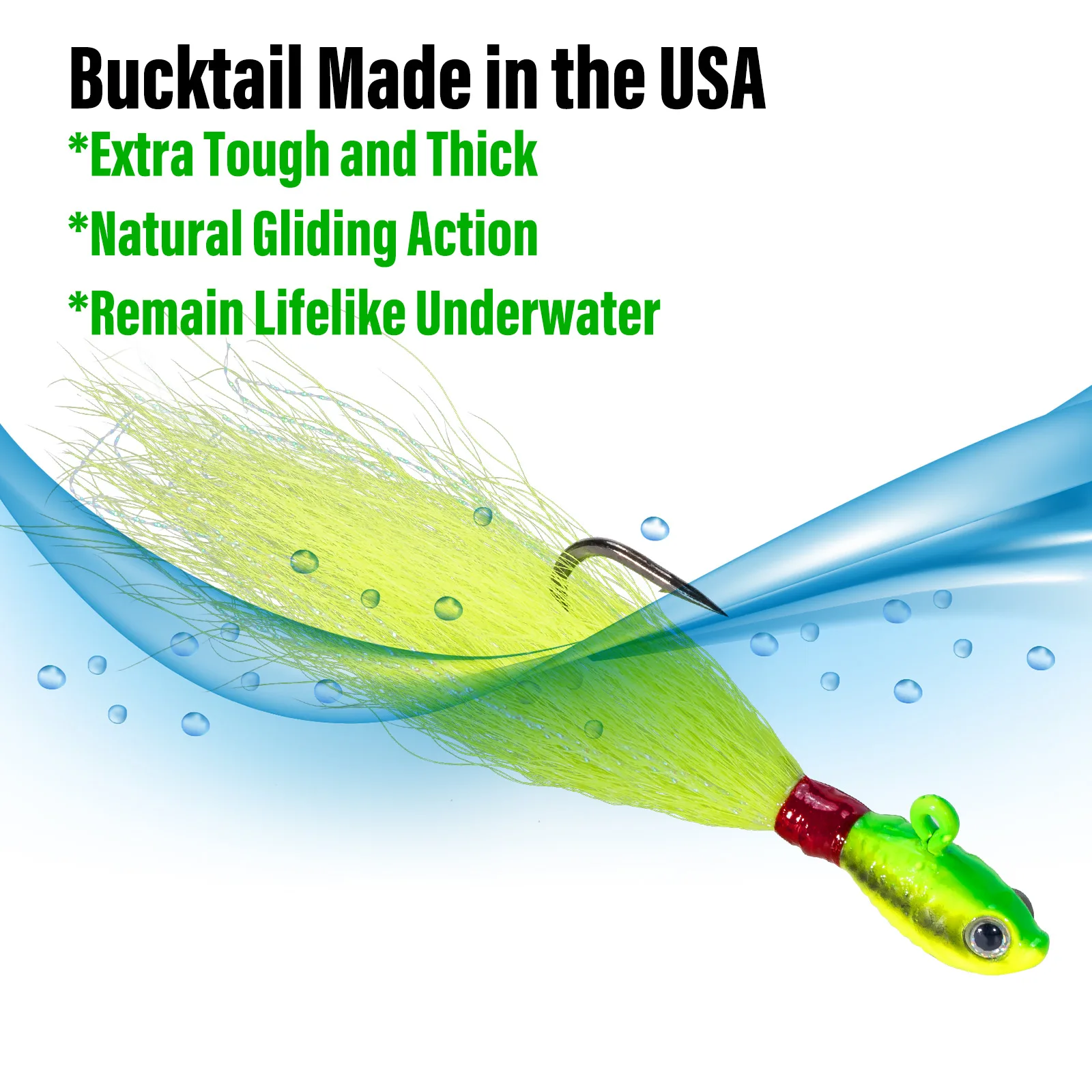 Alta calidad:Bucktail hecho en los EE. UU., proporciona deslizamientos realistas y acción de natación en el agua, establece esta plantilla de aquellos productos que cuelgan hacia abajo después de golpear el agua.