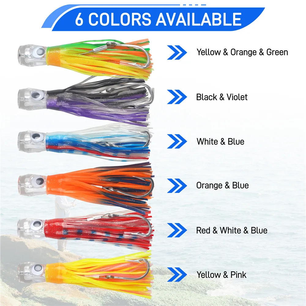 3. Las especies objetivo incluyen Marlin, pez vela, atún, caballa, pez rey, Ahi, pez delfín, Barracuda, Wahoo y cualquier pez de caza en salada/agua dulce. Señuelos de pesca con faldas de pesca.