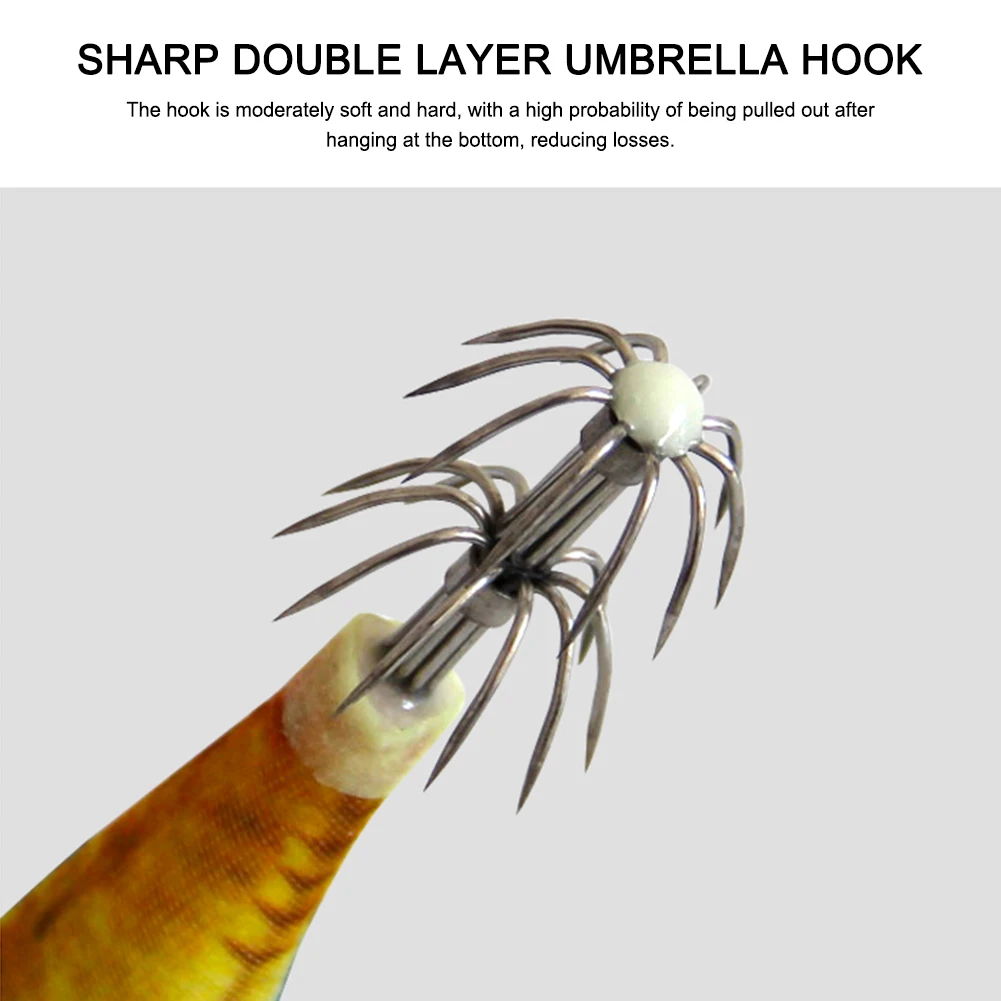 3. Posicionamiento estable en el agua:El diseño de gancho de doble capa para paraguas de Estos cebos de plantilla de calamar garantiza que mantengan una postura horizontal en el agua. Combinados con su apariencia natural y tonos de color, facilitan que los calamares muerdan y permanezcan enganchados.