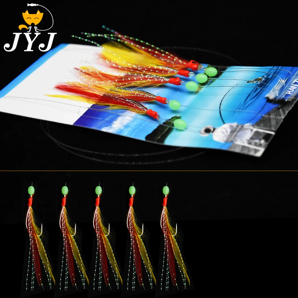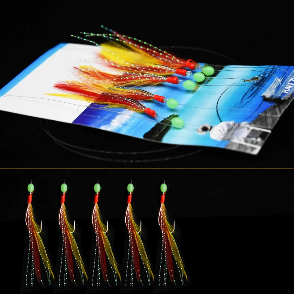 Señuelo de pesca artificial, 2 bolsas de tamaño de anzuelo 1/2/3/4, aparejos sabiki, con 5 plumas, cuentas luminosas para pesca nocturna