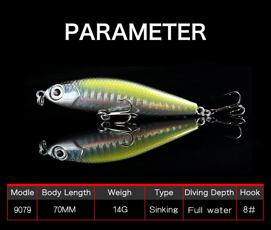 6. Bolas de metal: Bolas de acero inoxidable en el interior, para mantener el equilibrio del señuelo de pesca, para la mayor distancia de lanzamiento.