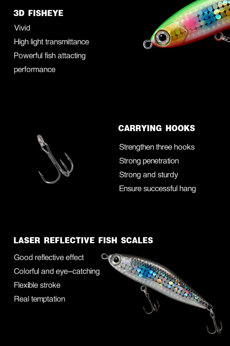 3. Los cebos tienen pintura realista y ojos 3D vívidos, hacen que el cebo parezca un pez real nadando en el agua durante la pesca.