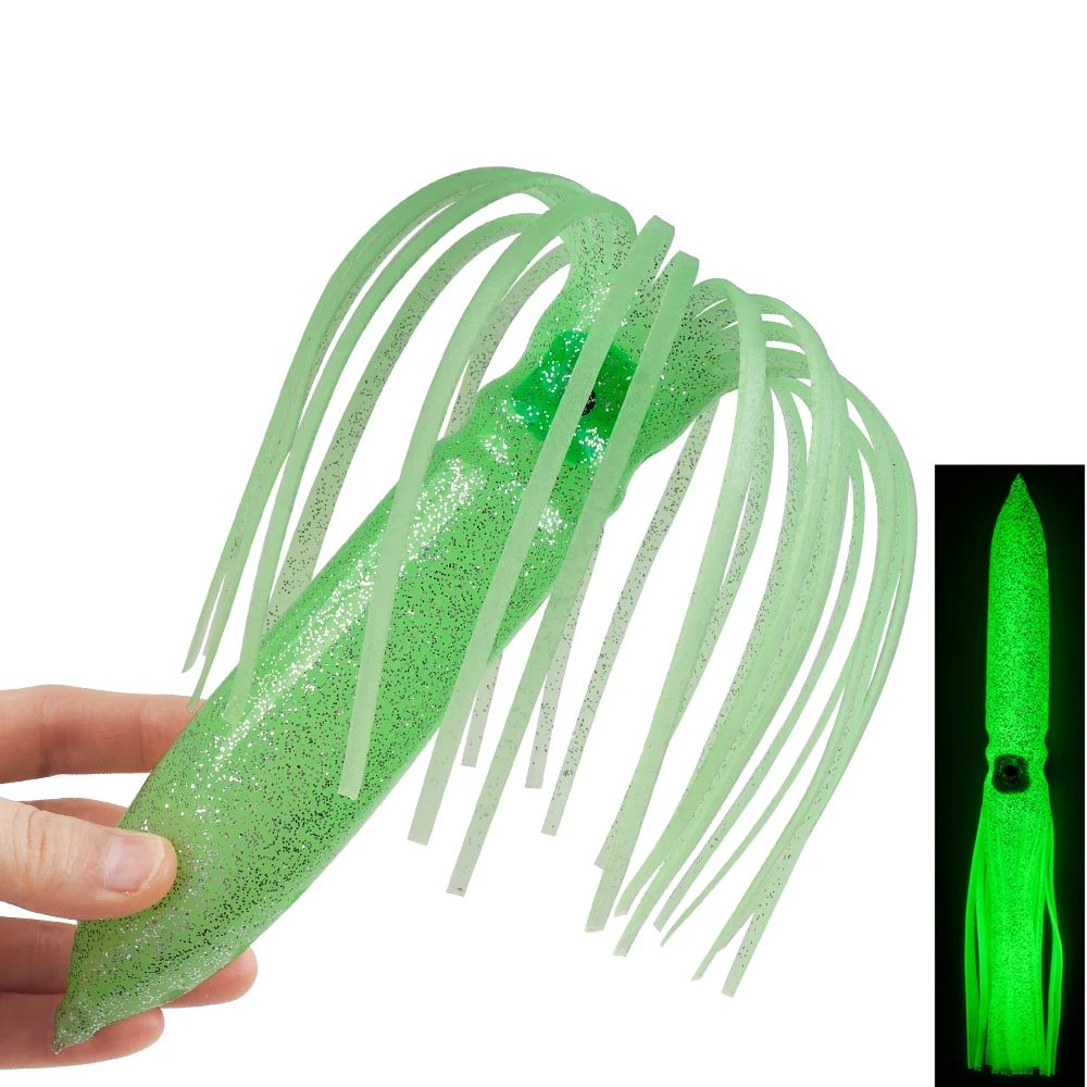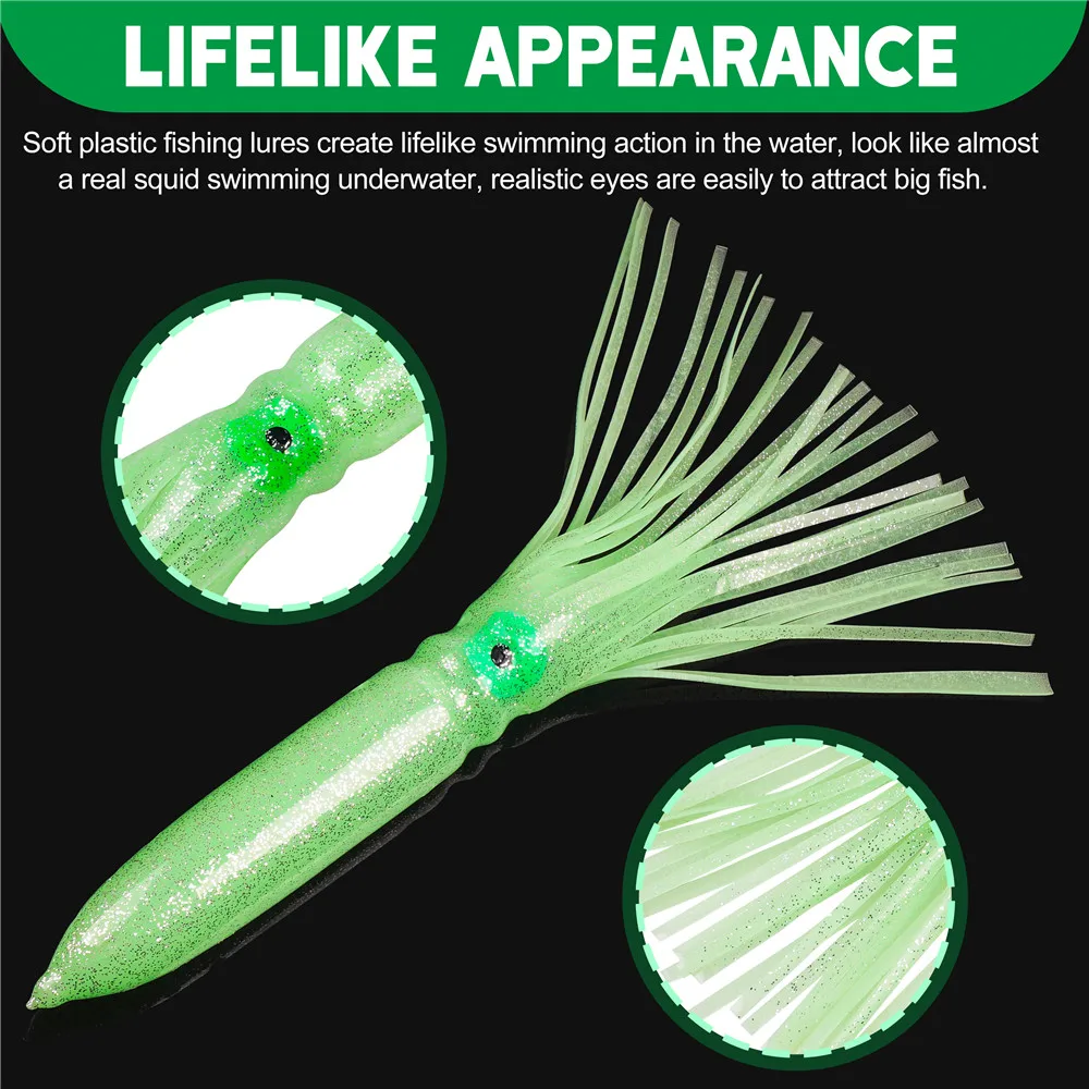 1. Los señuelos de pesca de arrastre de faldas de calamar están hechos de material de PVC de primera calidad, resistencia al desgarro y buena elasticidad. Es realista, señuelos de agua salada para peces grandes.
