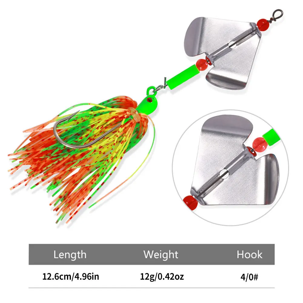 1.El cebo zumbido está compuesto de alambre de acero, una hoja triangular giratoria, plantillas de cabeza de pez realistas y faldas de plástico, una gran herramienta para ubicar lubina en las superficies poco profundas.