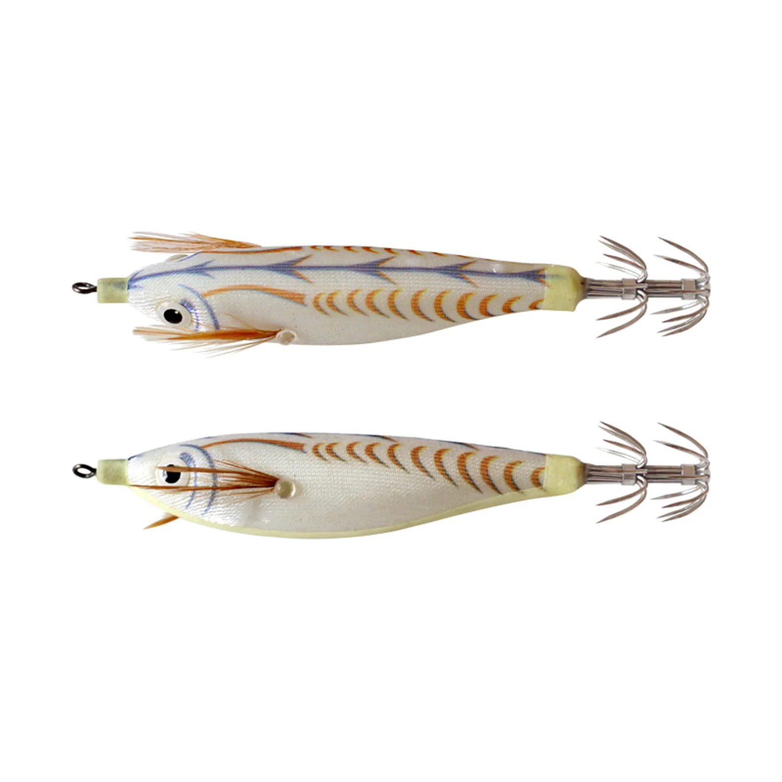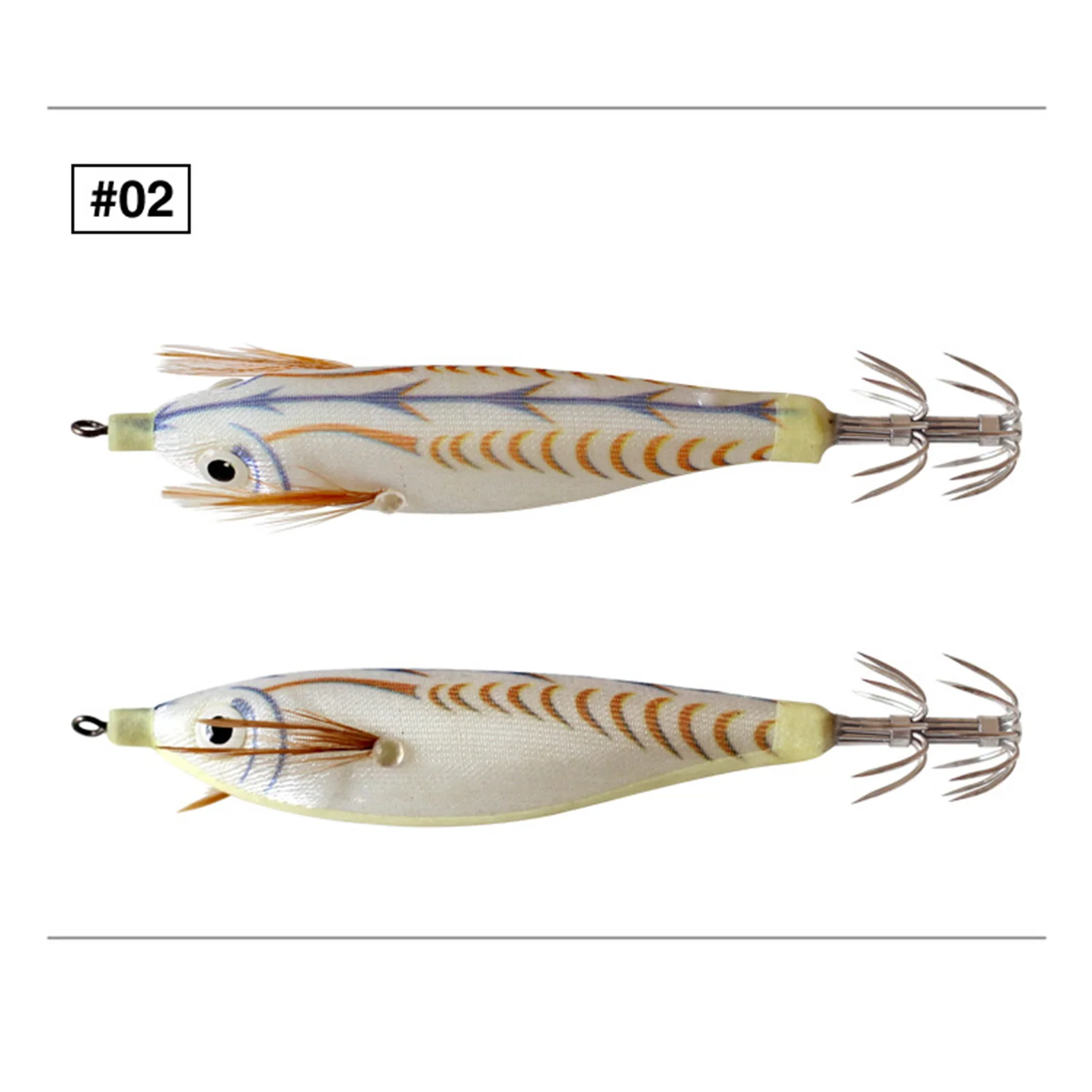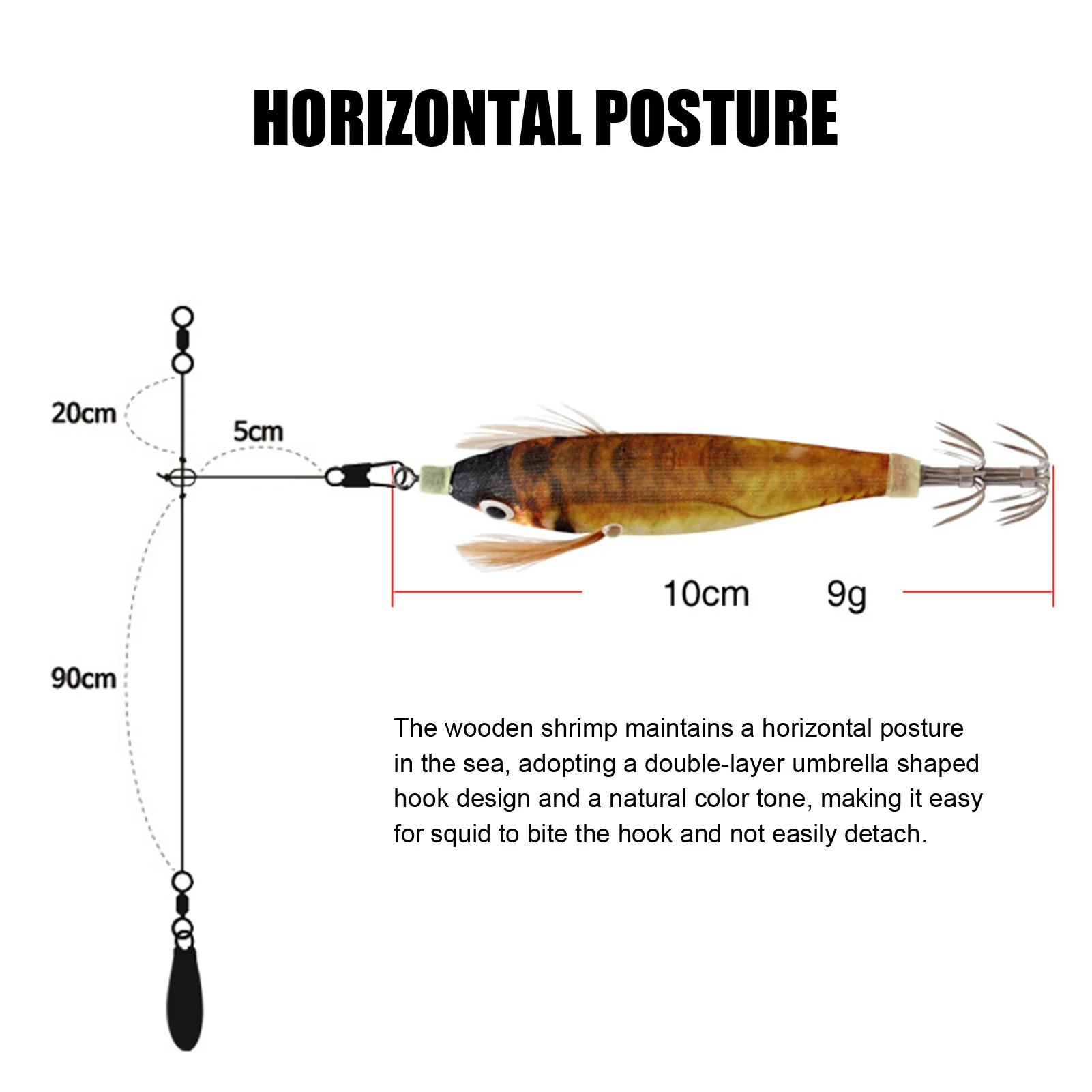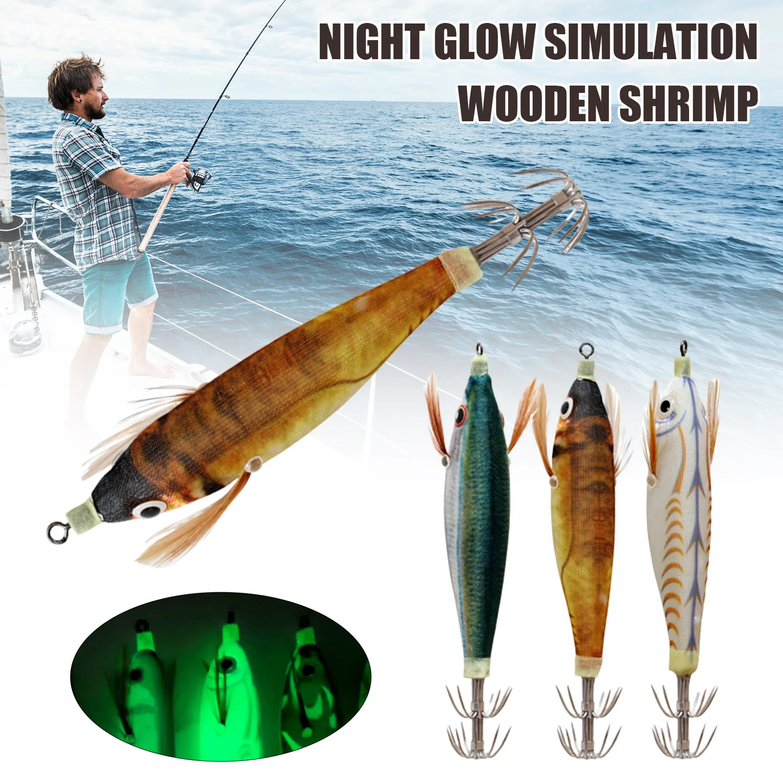 Juego de pesca versátil: este juego de cebo de madera para camarones incluye plantillas luminosas de calamar, anzuelos de sepia y señuelos sin púas, lo que lo hace adecuado para la pesca en agua salada, pulpos, calamares grandes y diversas necesidades de aparejos de pesca.