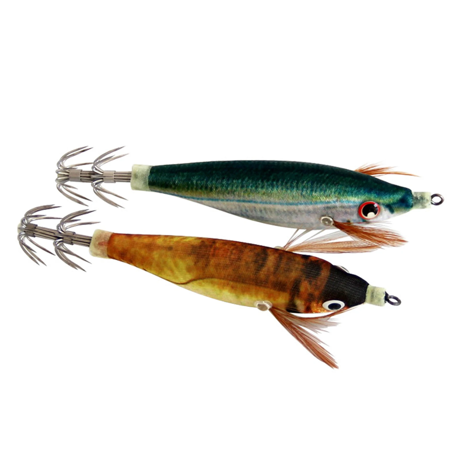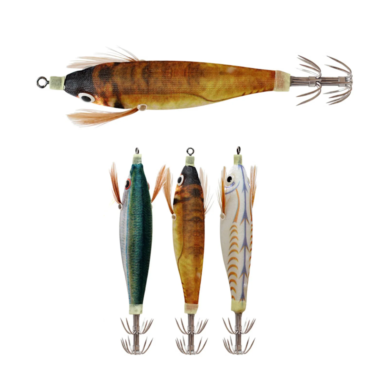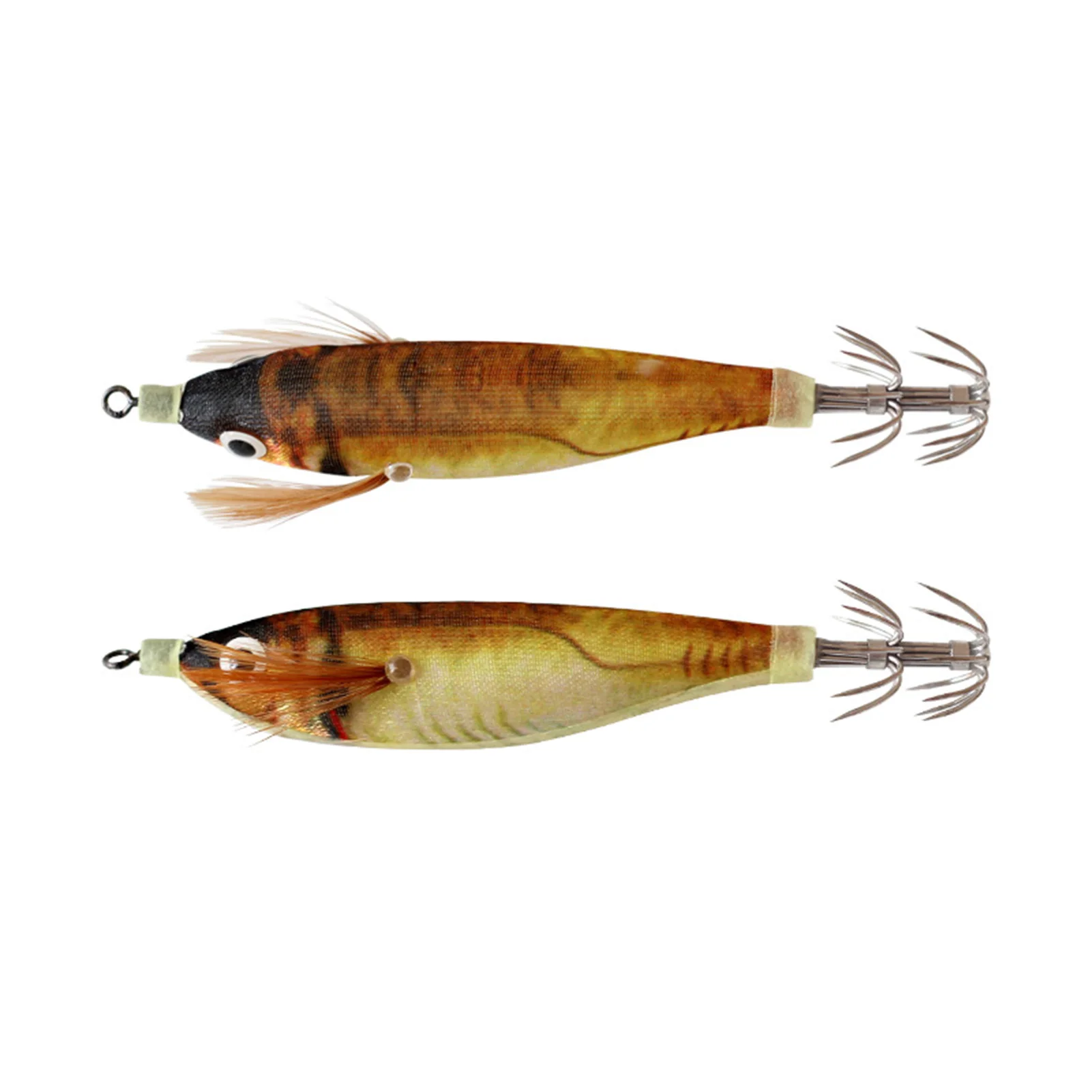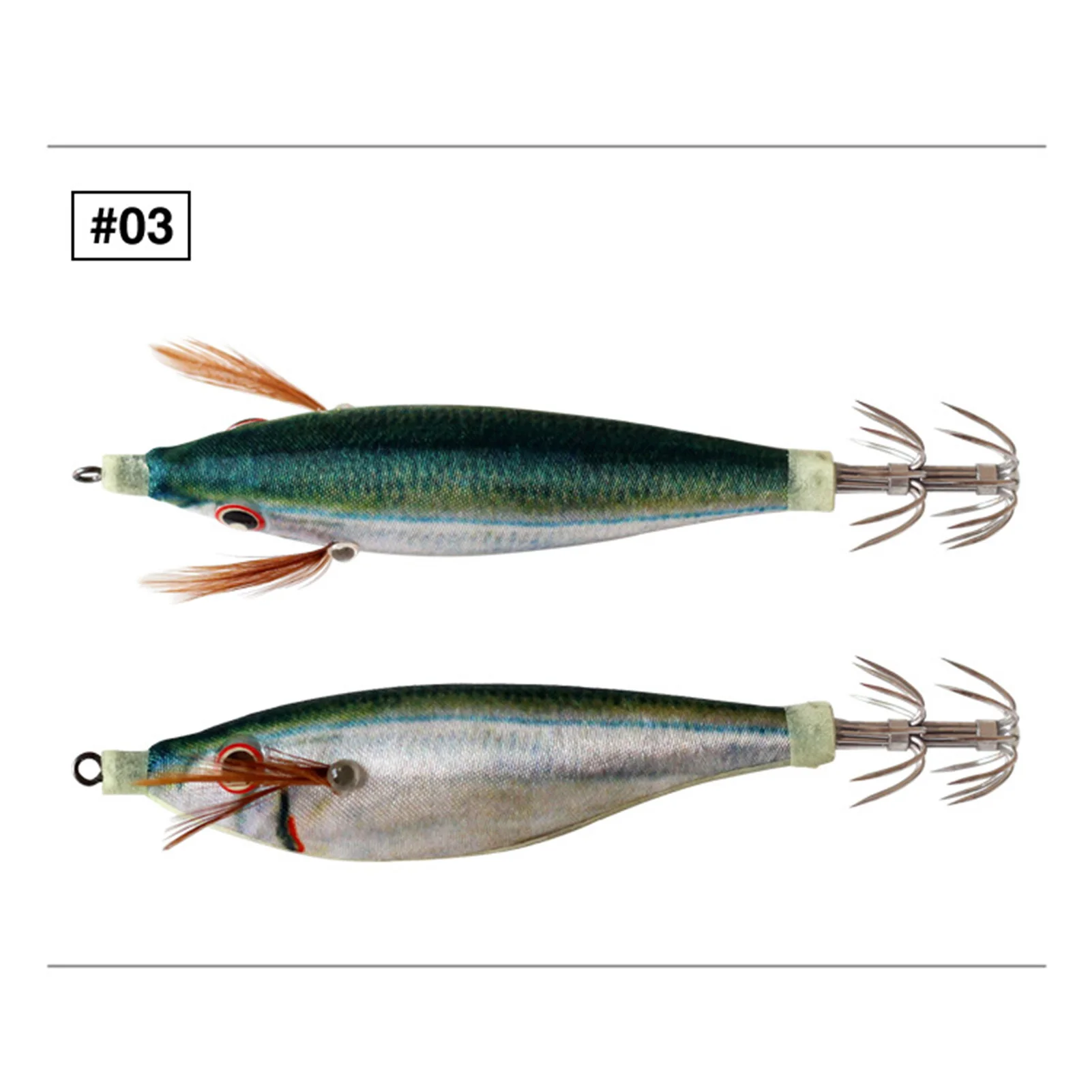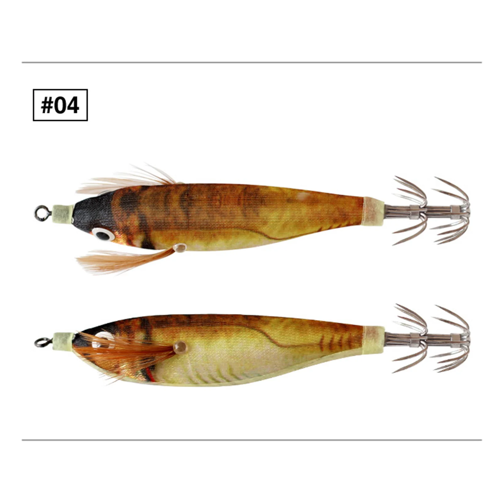 Juego de pesca versátil: este juego de cebo de madera para camarones incluye plantillas luminosas de calamar, anzuelos de sepia y señuelos sin púas, lo que lo hace adecuado para la pesca en agua salada, pulpos, calamares grandes y diversas necesidades de aparejos de pesca.