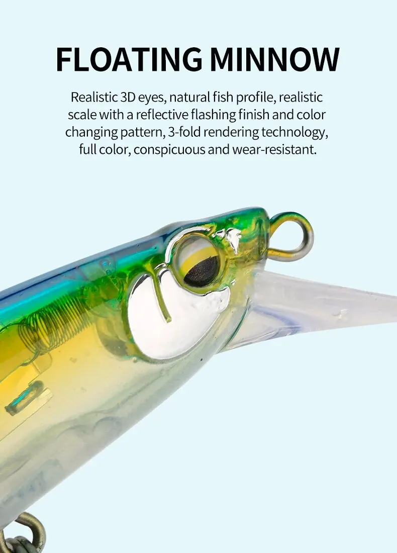 The almost transparent fish body gives you a real visual experience. Strictly selected colors and designs, painted brilliant colors and patterns, for covering various conditions.Multi-layered reflective finishes, complete with natural color and 3D lifelike eyes can attract more fish.