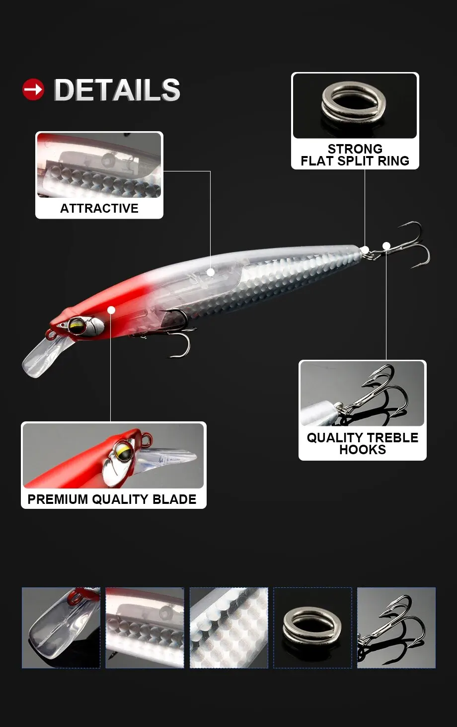 Durable ABS construction, reusable & environment protective swimbait, rigged with rust-proof sharp treble hooks, excellent puncture ability, strong abrasion resistant.