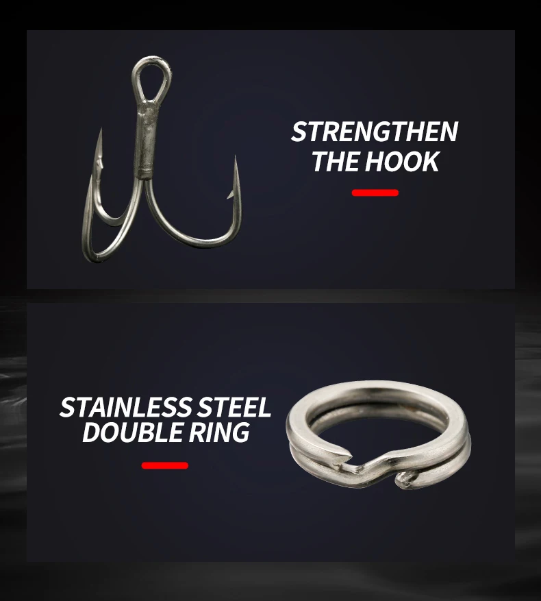 Durable ABS construction, reusable & environment protective swimbait, rigged with rust-proof sharp treble hooks, excellent puncture ability, strong abrasion resistant.