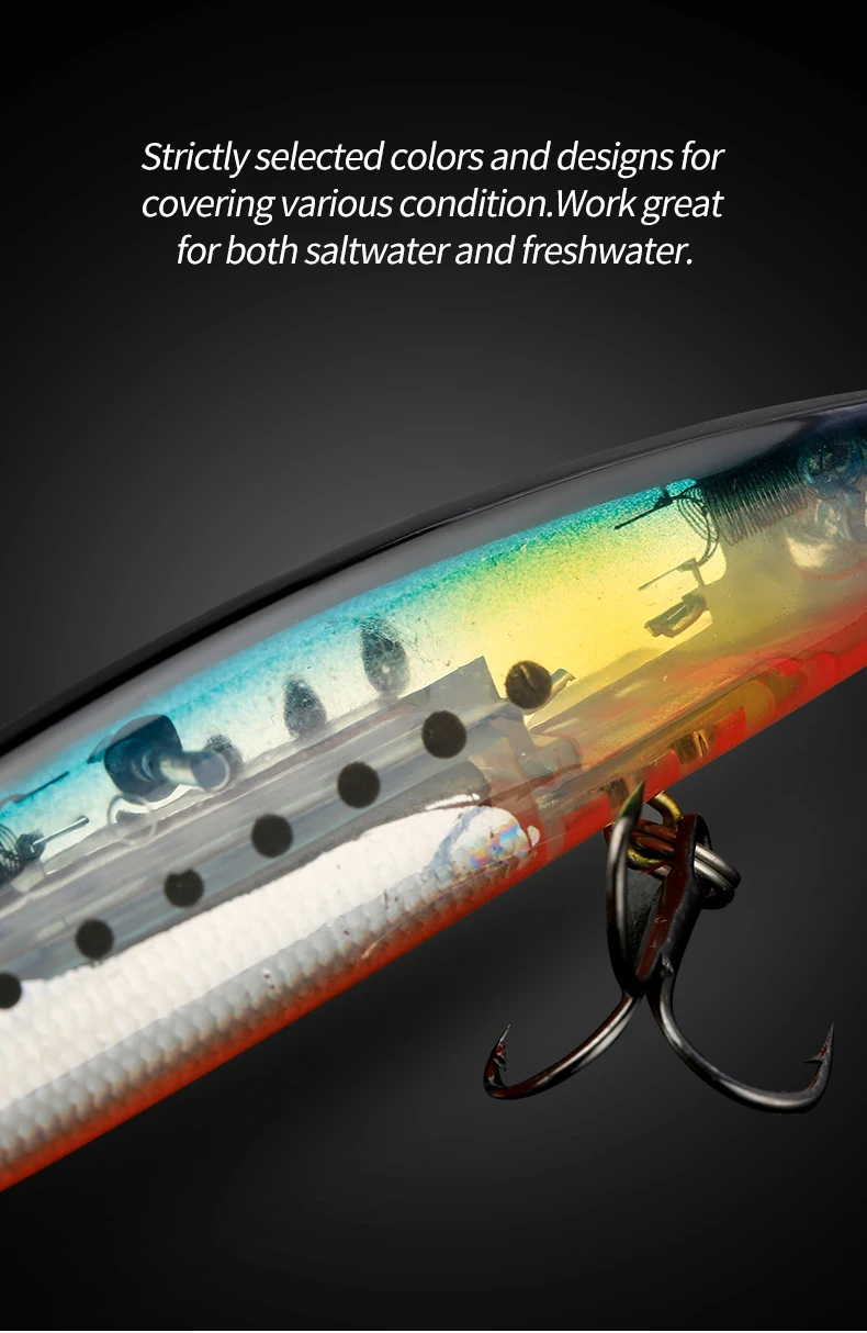 The almost transparent fish body gives you a real visual experience. Strictly selected colors and designs, painted brilliant colors and patterns, for covering various conditions.Multi-layered reflective finishes, complete with natural color and 3D lifelike eyes can attract more fish.