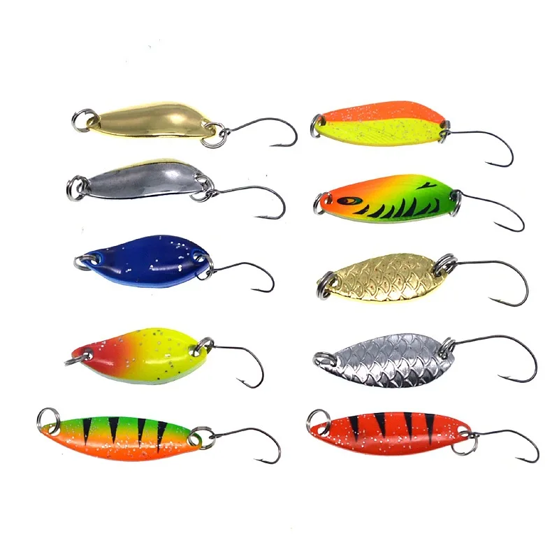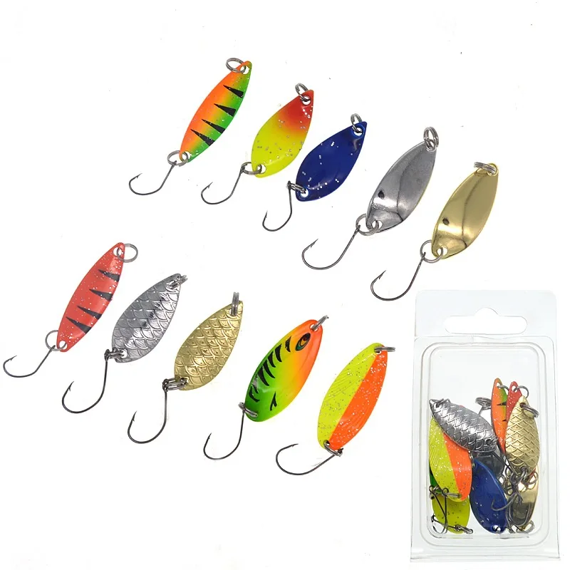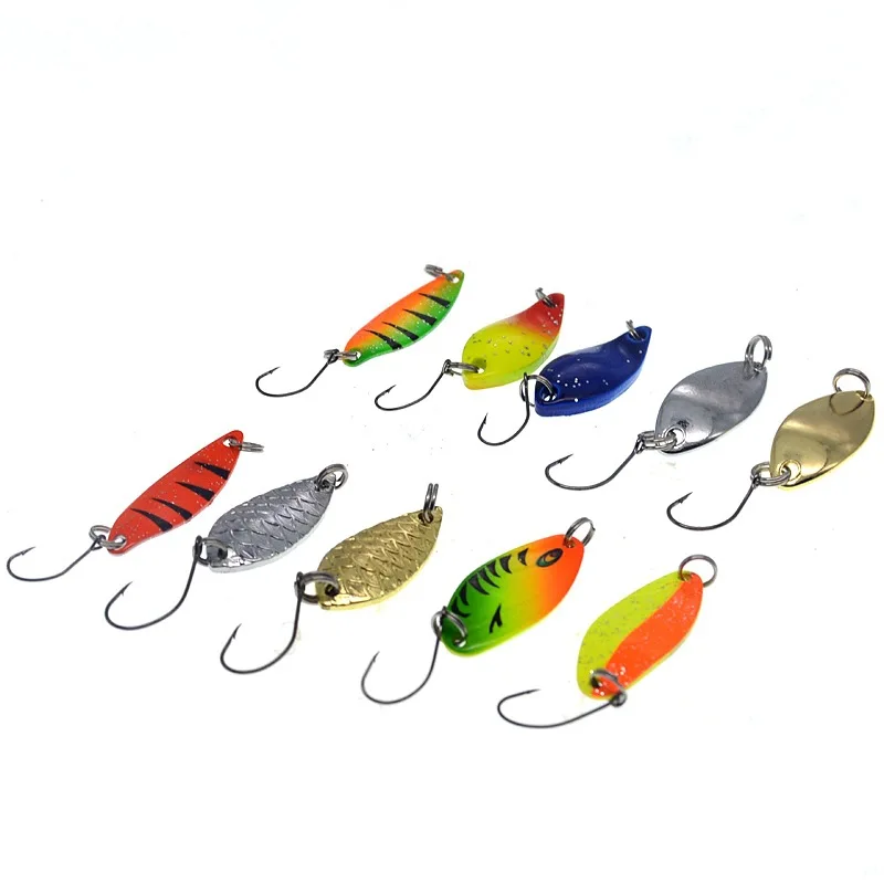 Señuelo de pesca cuchara colorida, 10 piezas, cucharas de 2-5g, plantilla de Metal duro, Kit de señuelos artificiales, accesorios de aparejos de pesca de un solo gancho