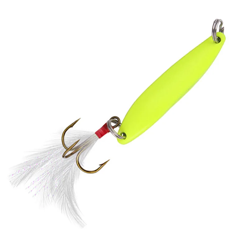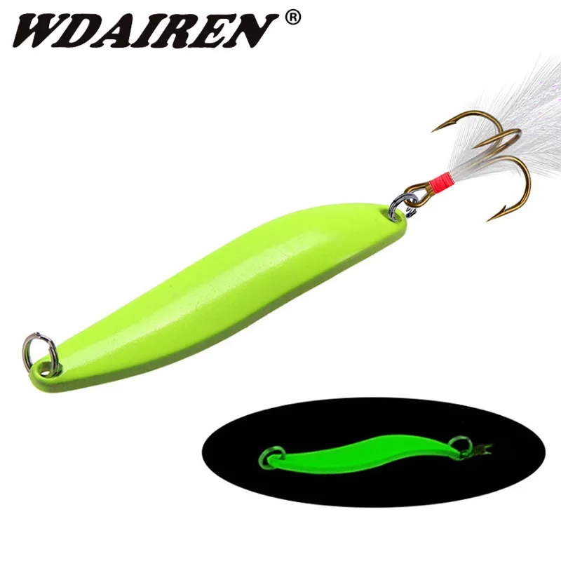 1 Uds. Cuchara giratoria luminosa de hoja de Metal, señuelo de pesca, cebo Artificial con gancho de plumas, aparejos de pesca de noche para lubina, Lucio y perca