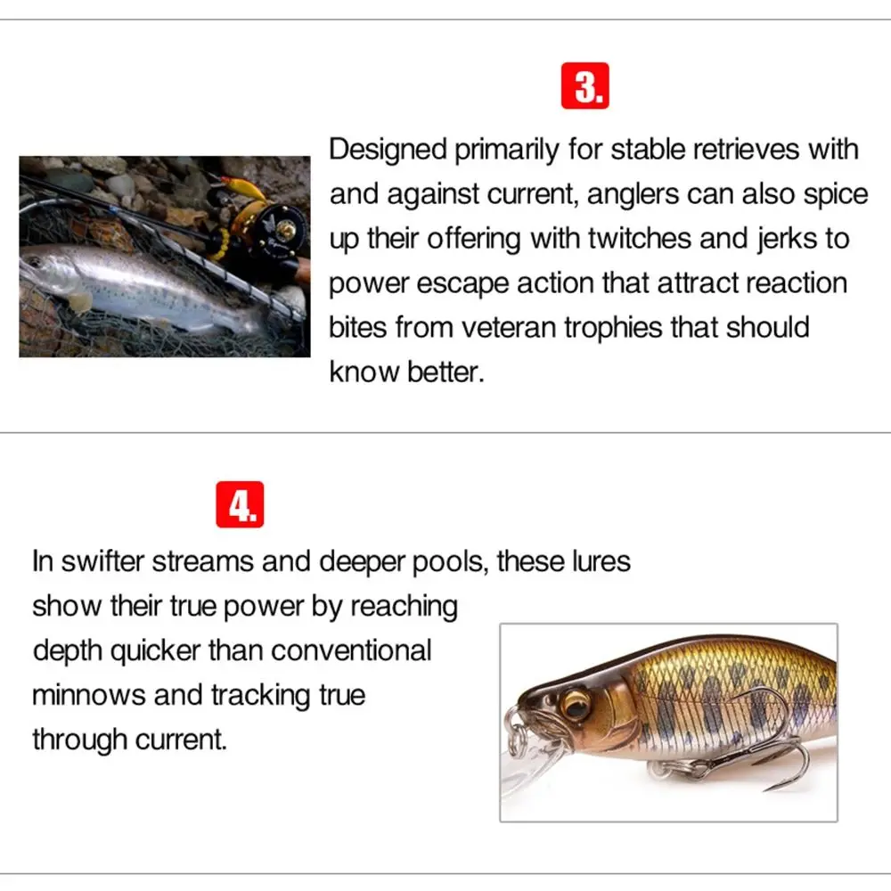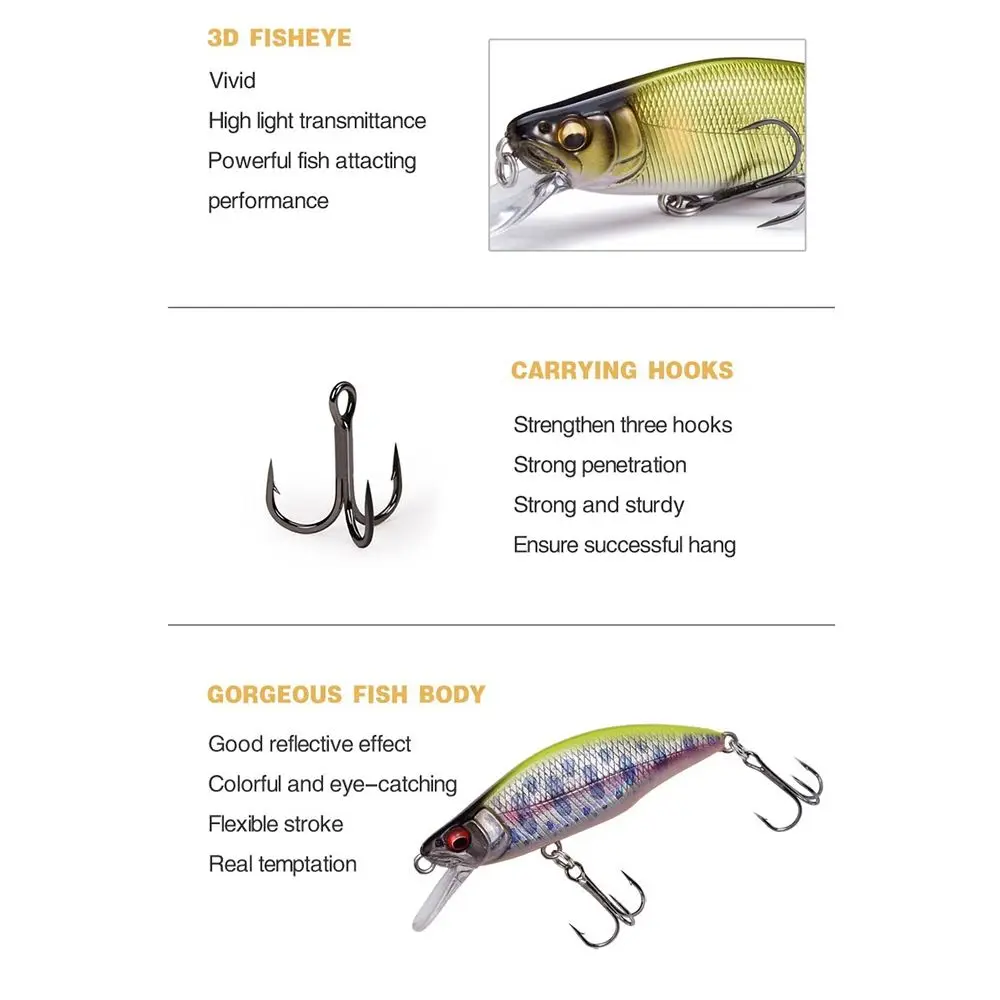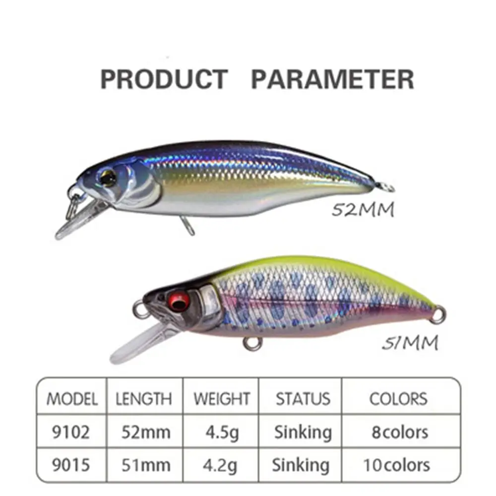 Modelo de señuelo: señuelo de pececillo de doble anzuelo Tipo de señuelo: señuelo de pesca duro Peso del señuelo: 4,2g/4,5G Longitud del señuelo: 51mm/52mm Anzuelos: equipado con 2 anzuelos anticorrosión de 2 ojos: ojos de pez 3D Colores: 18 colores Características del producto: 1. Material: plástico ABS, ojo de pez de simulación 3D, tres ganchos. 2. Los ojos 3D lo convierten en una herramienta perfecta para los entusiastas de la pesca. 3. El cuerpo colorido puede hacer que los peces sean fáciles de atrapar. 4. Vida útil y acción rápida. 5. Excelente efecto visual para atraer peces. 6. Este Tipo de cebo tendrá una acción de natación animada en el agua, lo que atraerá la atención y el ataque de los peces. El paquete incluye: 1 cebos Minnow