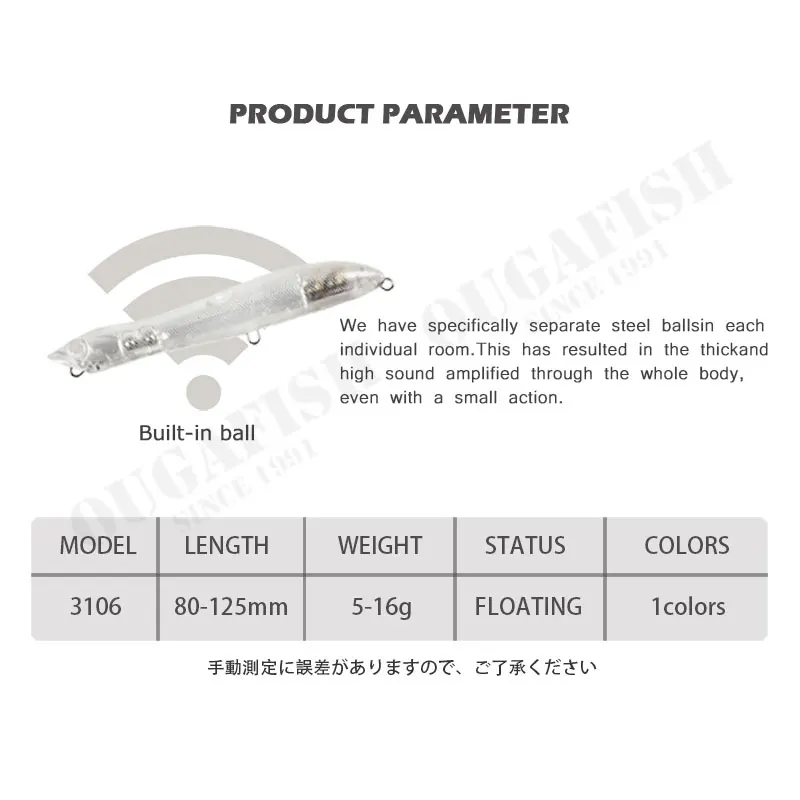 6. Bolas de metal: Bolas de acero inoxidable en el interior, para mantener el equilibrio del señuelo de pesca, para la mayor distancia de lanzamiento.