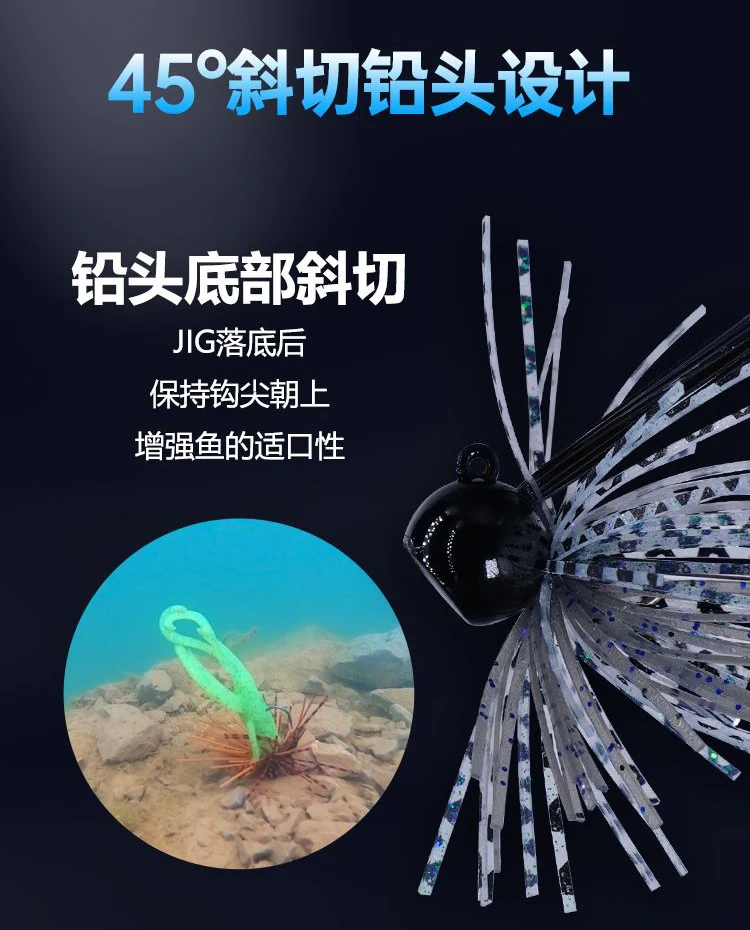 The bottom of the lead head is cut obliquely, and the hook tip is kept upward after the JIG falls to the bottom, which enhances the palatability of the fish.