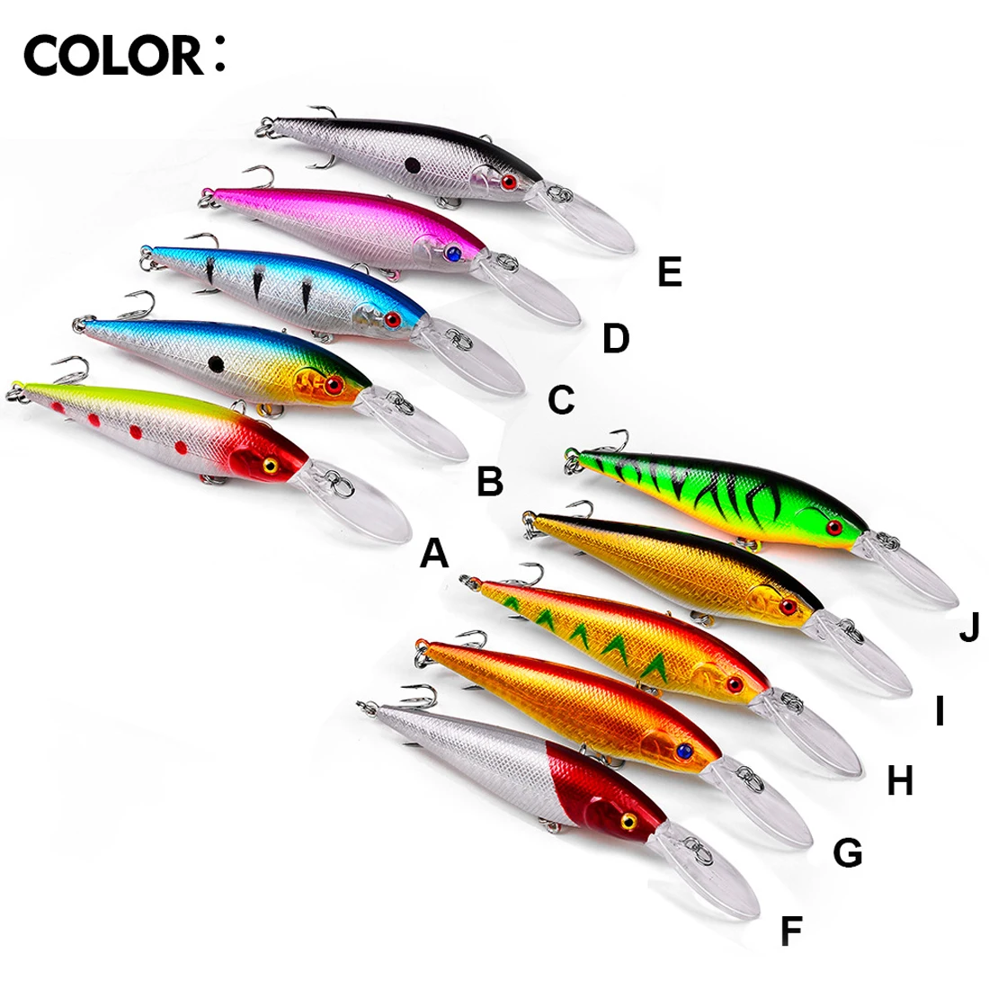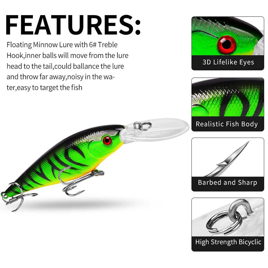 El señuelo de pesca generalmente presenta una curva larga y atractiva con colores brillantes para atraer rápidamente la atención de los peces, lo que le permite crear una acción de tambaleo aguda mientras nada.Imita los movimientos de un cebo fugaz o surtido y los convierte en una excelente opción para pescar aguas manchadas o vegetación intensa, llamando a los peces fuera de cobertura.