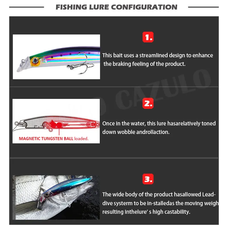 6. Bolas de metal: Bolas de acero inoxidable en el interior, para mantener el equilibrio del señuelo de pesca, para la mayor distancia de lanzamiento.