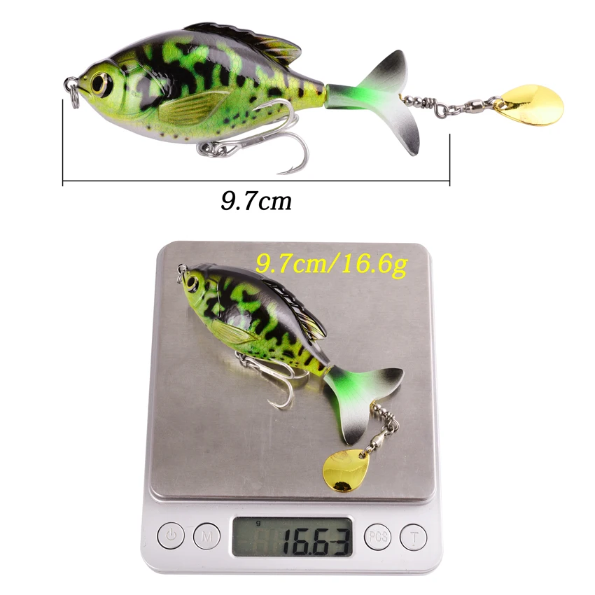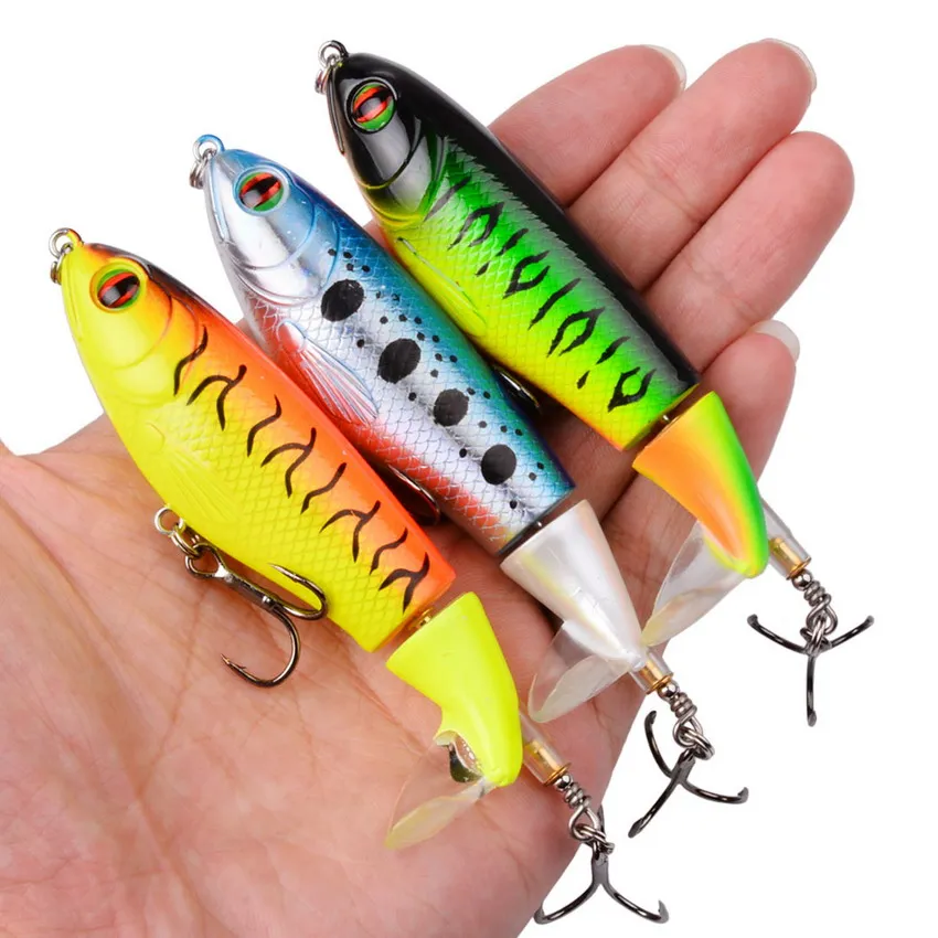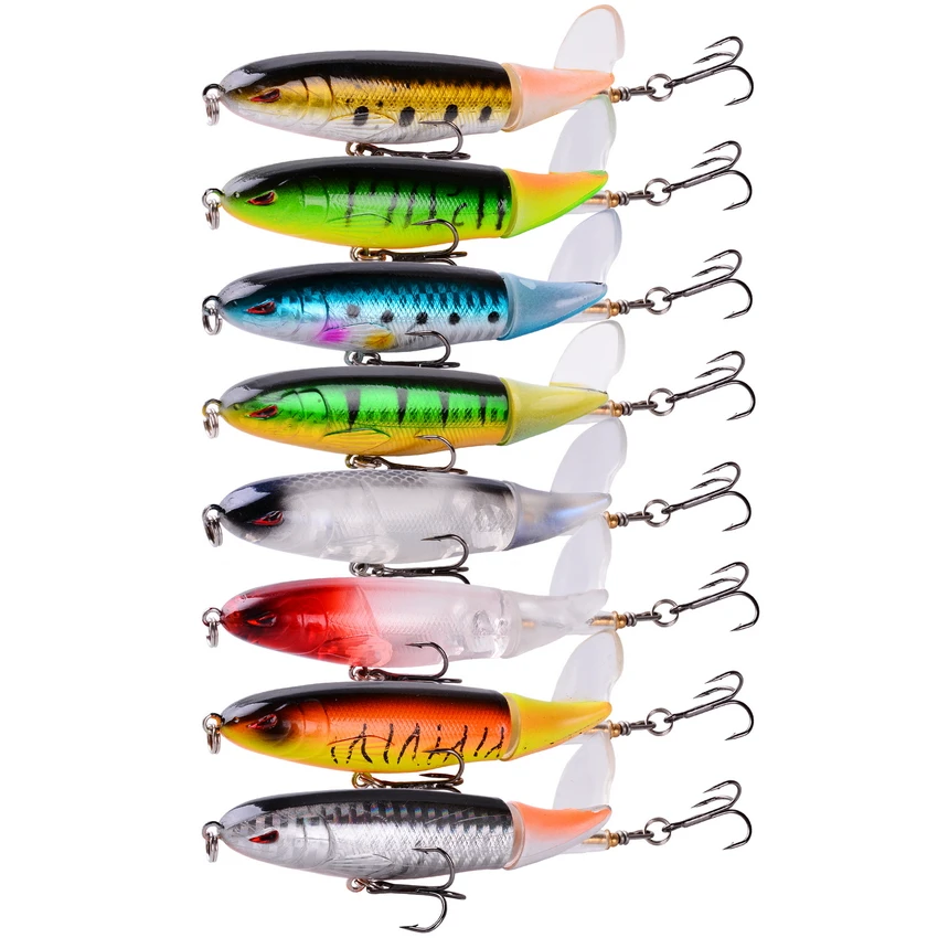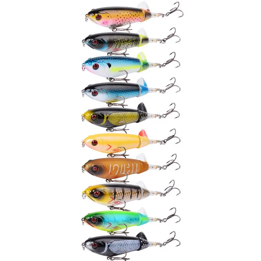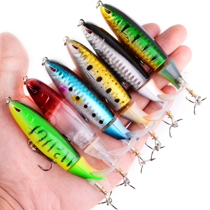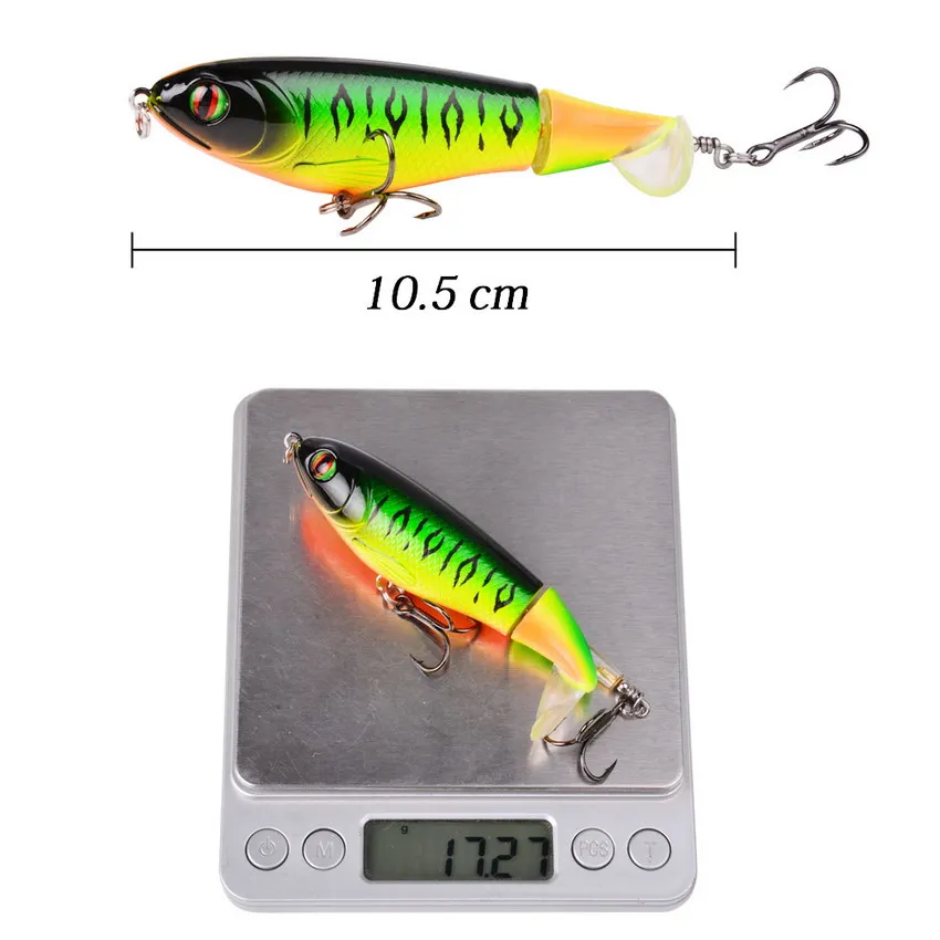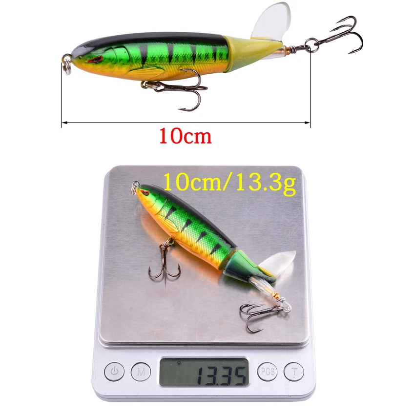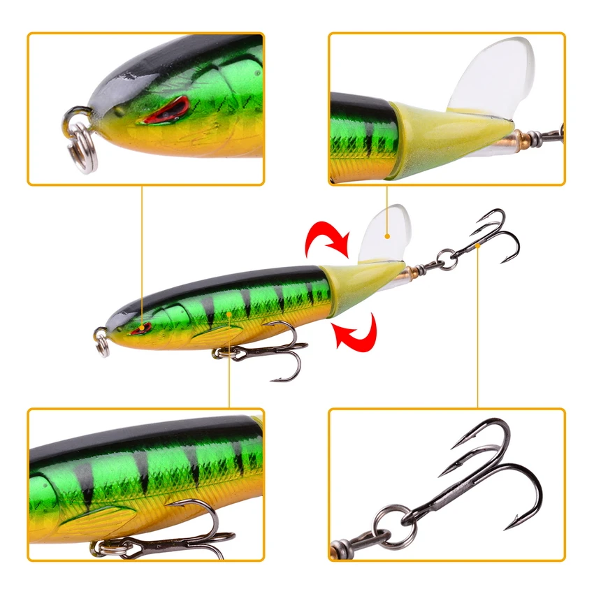 Girar rápidamente la cola puede atraer mejor a los peces a morder en el agua.Anillo doble más fuerte: fortalece el anillo doble y aumenta la resistencia a la tracción.Gancho: equipado con gancho anticorrosiónOjos 3D realistas y detalles corporales realistas como peces reales hacen que se vea natural como cebo vivo.Maravillosos accesorios de pesca para entusiastas de la pesca. Ideal para pesca de trucha, raya, mero, lanza, almizcle, calamar, calamar, etc.Especificación:Tipo de Cebo: PopperProfundidad de buceo: agua superiorAguas adecuadas: todas las aguasAnillo: Anillo plano reforzadoPescado objetivo: pescado blanco, perca, lanza, atún blanco, perca china, criadores de Topmouth