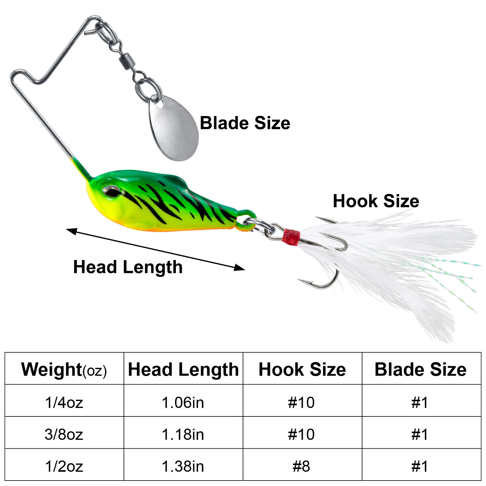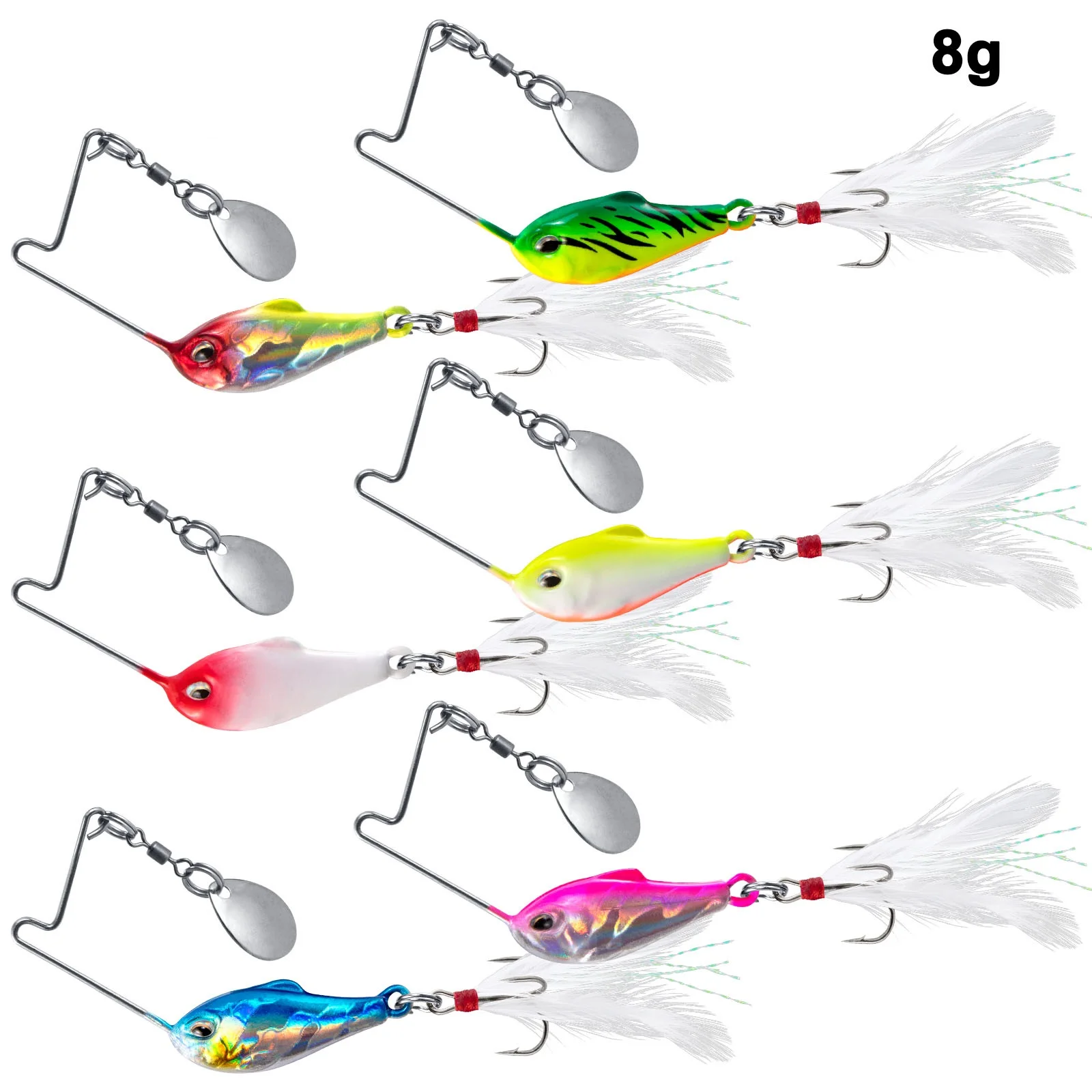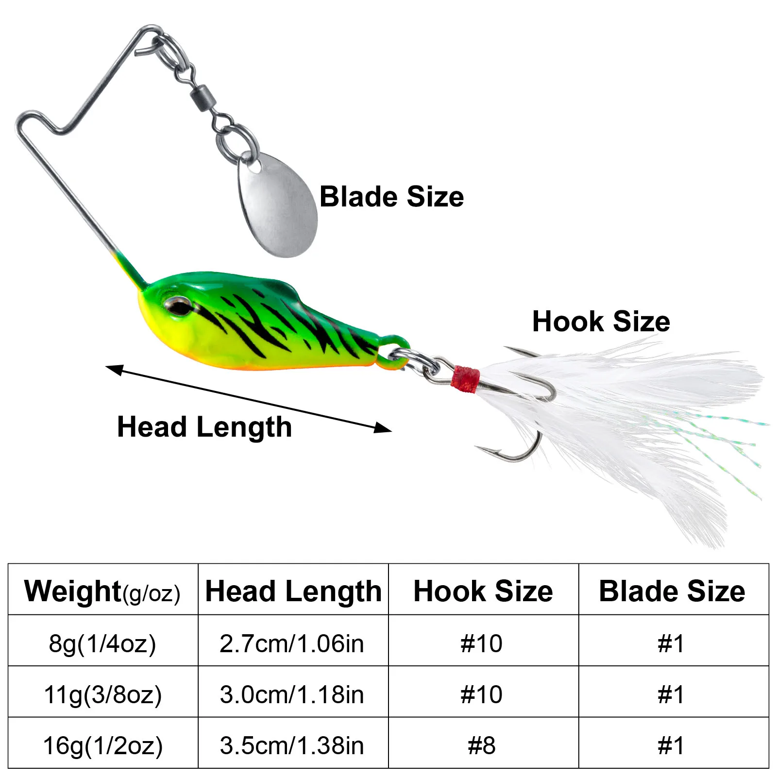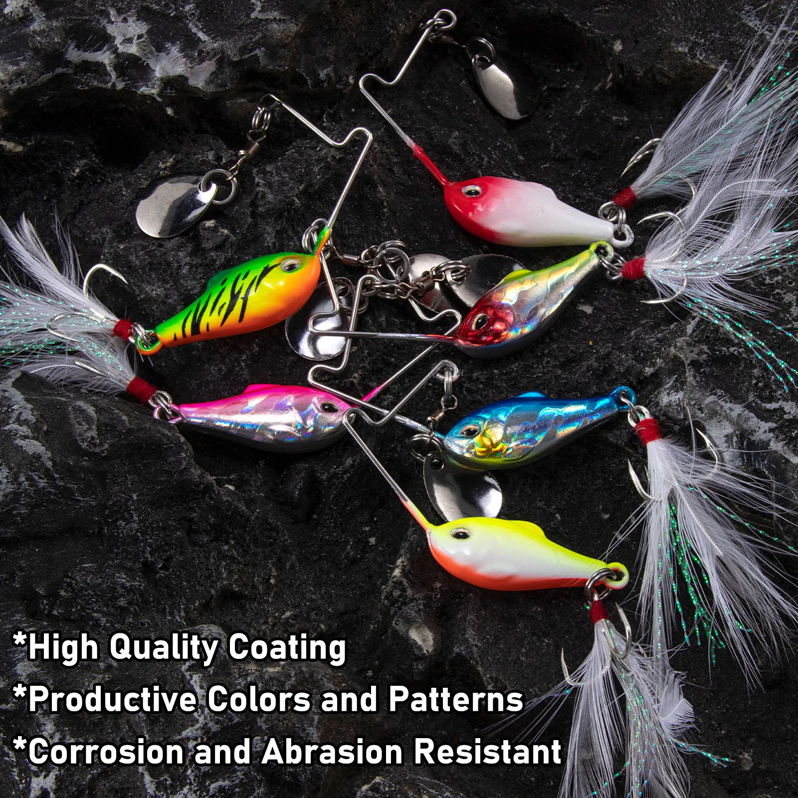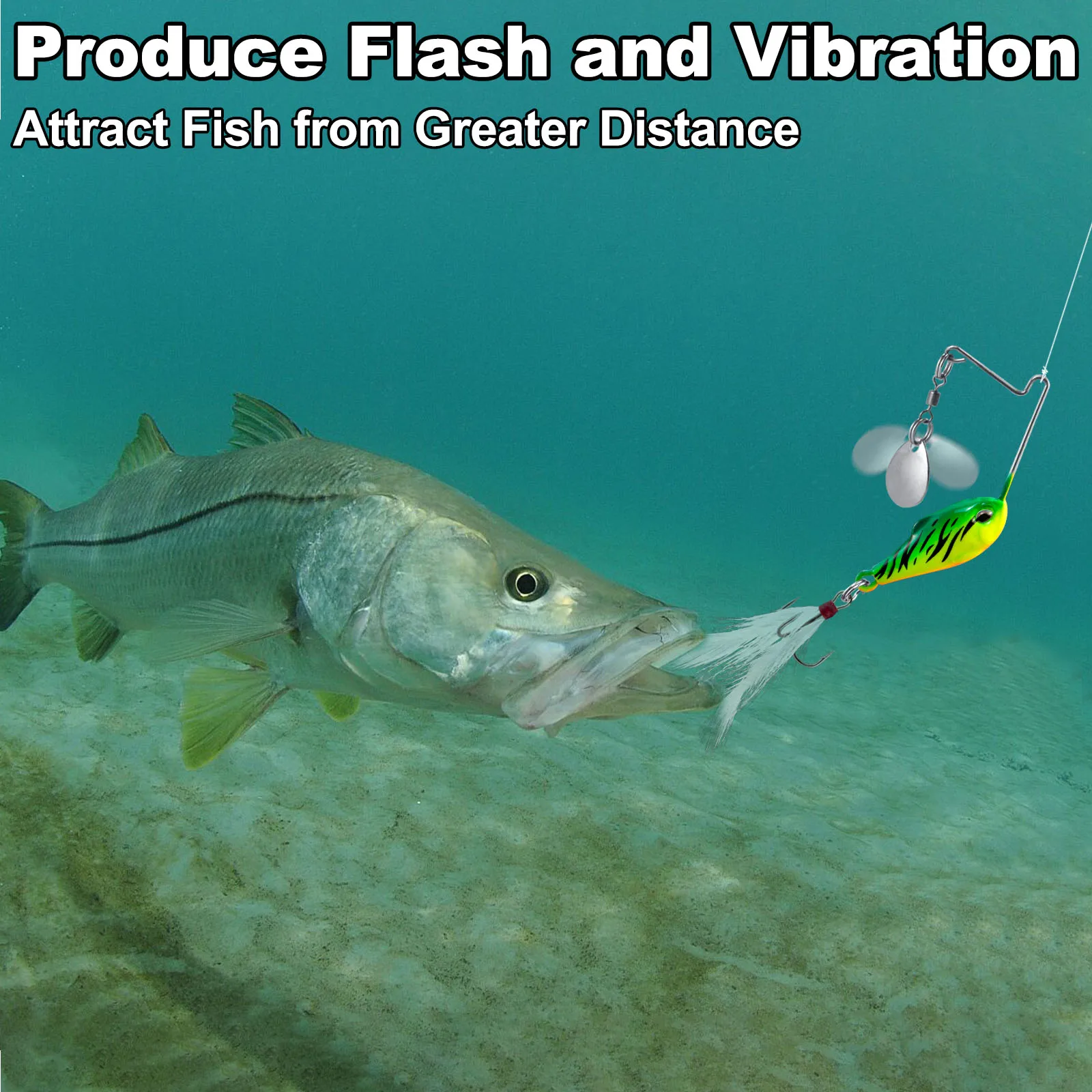Los ganchos triples de acero de alto carbono de alta calidad son extremadamente afilados para una penetración ultrarrápida y súper fuertes para resistir la flexión. Los Spinnerbaits con plumas e hilos brillantes atados al extremo pueden atraer a los peces a morder.