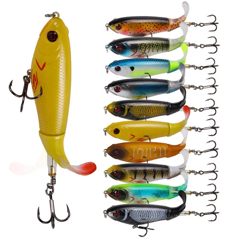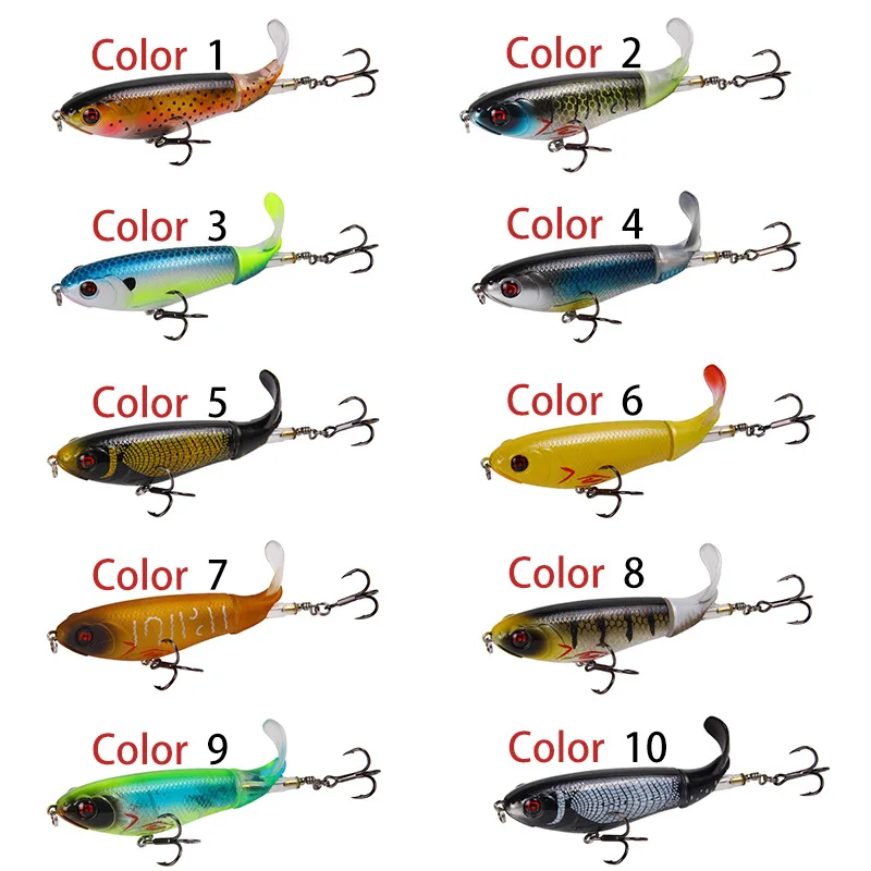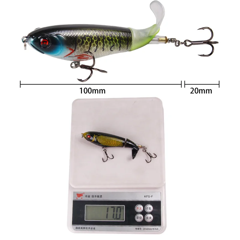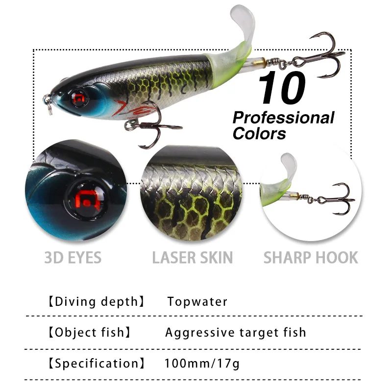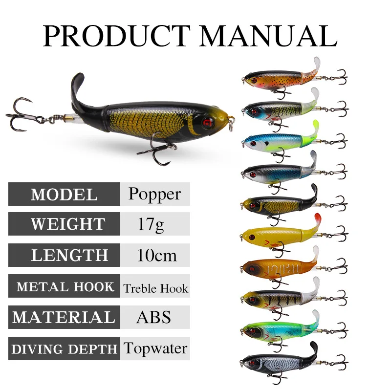 Tip: If you have not received the goods, the goods are missing and damaged, please contact the seller in time!Friends who choose rookie logistics, pay special attention to the fact that this logistics does not have online tracking.The post office mentions it, so please contact the seller to check the logistics status in time, thank you for your cooperation!3D eyes make it perfect tool for fishing lovers.Colorful body can make it easy to catch fish.Lifelike and rapid action in water.Excellent visual effect of luring fish.Product Details:Type: Popper baitWeight: 17GLength: 10CMColor: 10colorsDepth: 0-0.1mNote:1.Please allow 1-3mm error due to manual measurement. Pls make sure you do not mind before you bid.2.Due to the difference between different monitors, the picture may not reflect the actual color of the item.3.The hook is extremely sharp. Please take care for handle it.Keep it out of children's reach