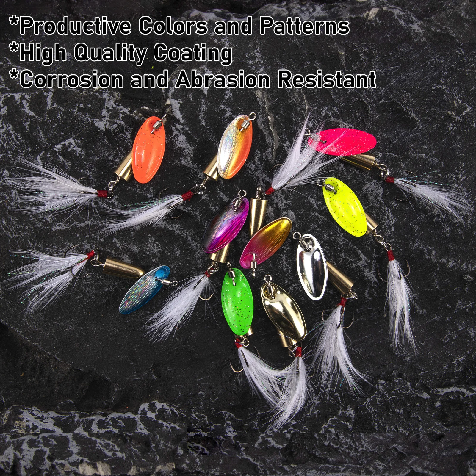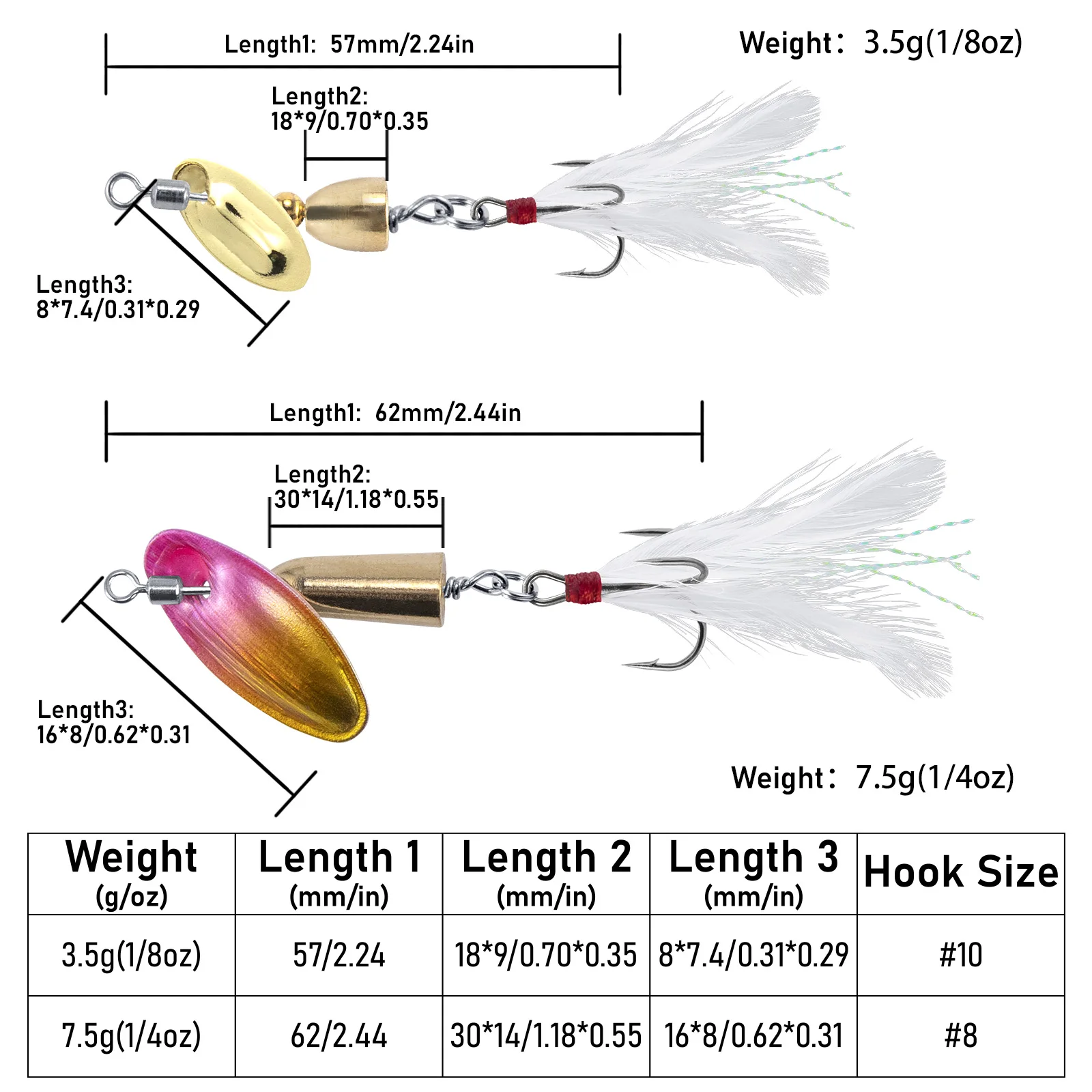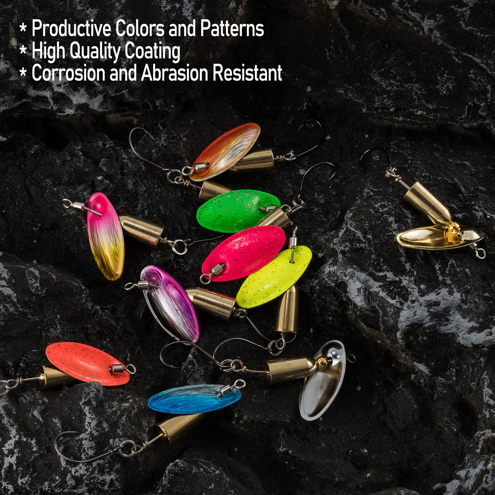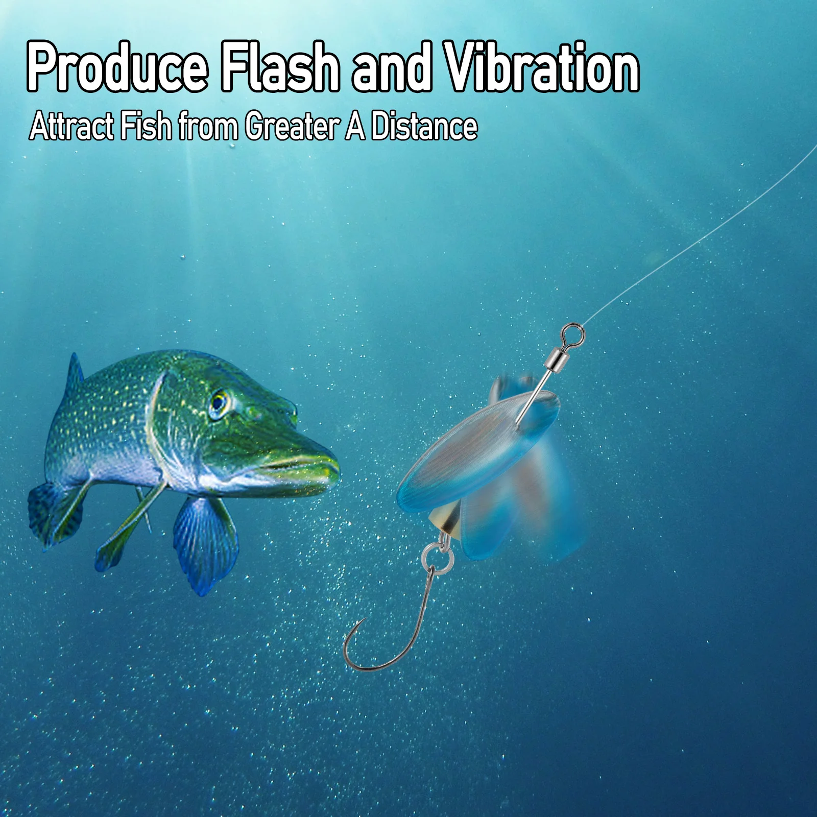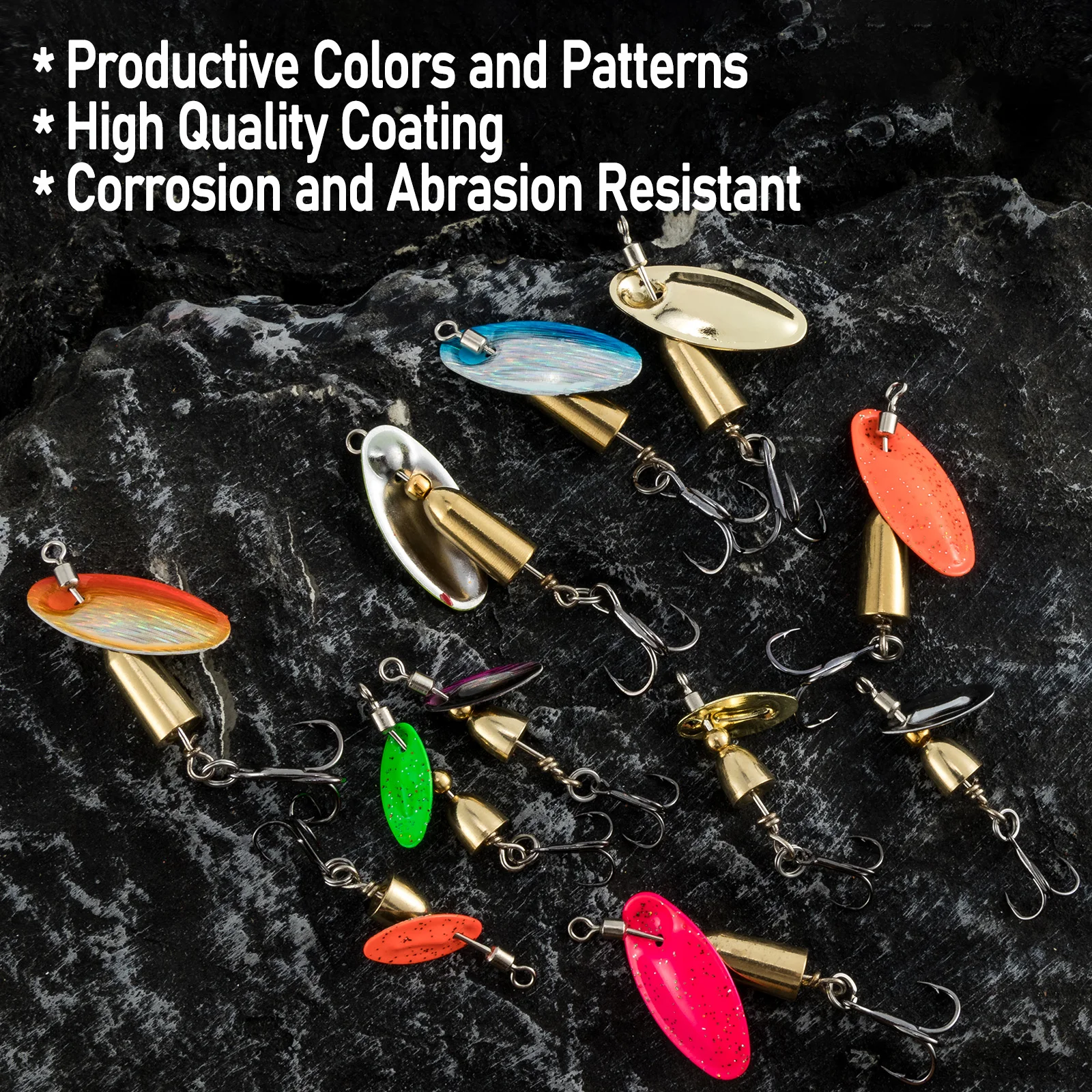 【Cebos giratorios para truchas】 Fabricado con componentes de alta calidad que incluyen grúa giratoria de 360 °, hoja giratoria de pintura colorida, cuentas de pesca, peso de latón, anillo dividido de acero inoxidable y anzuelo único de acero de alto carbono #8.