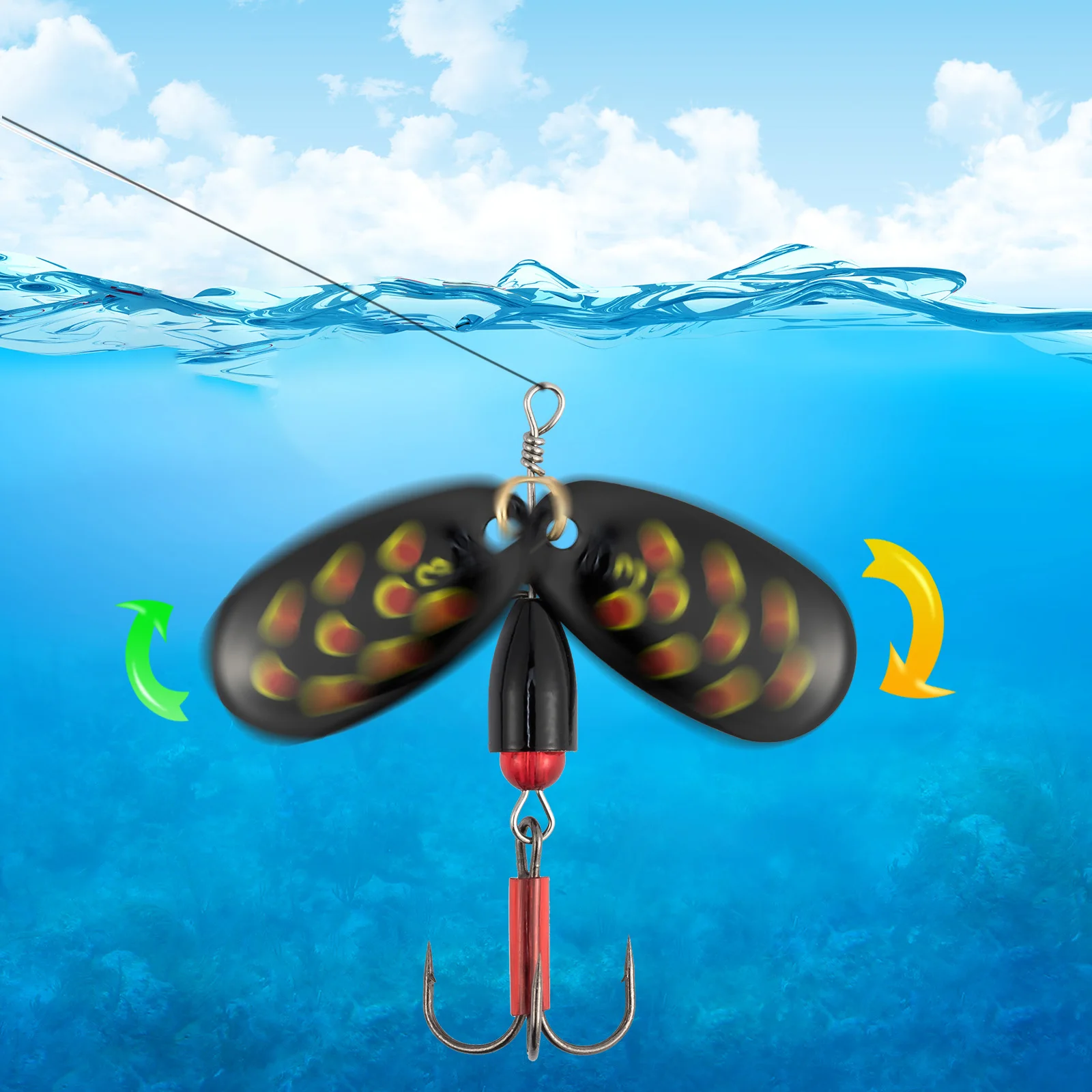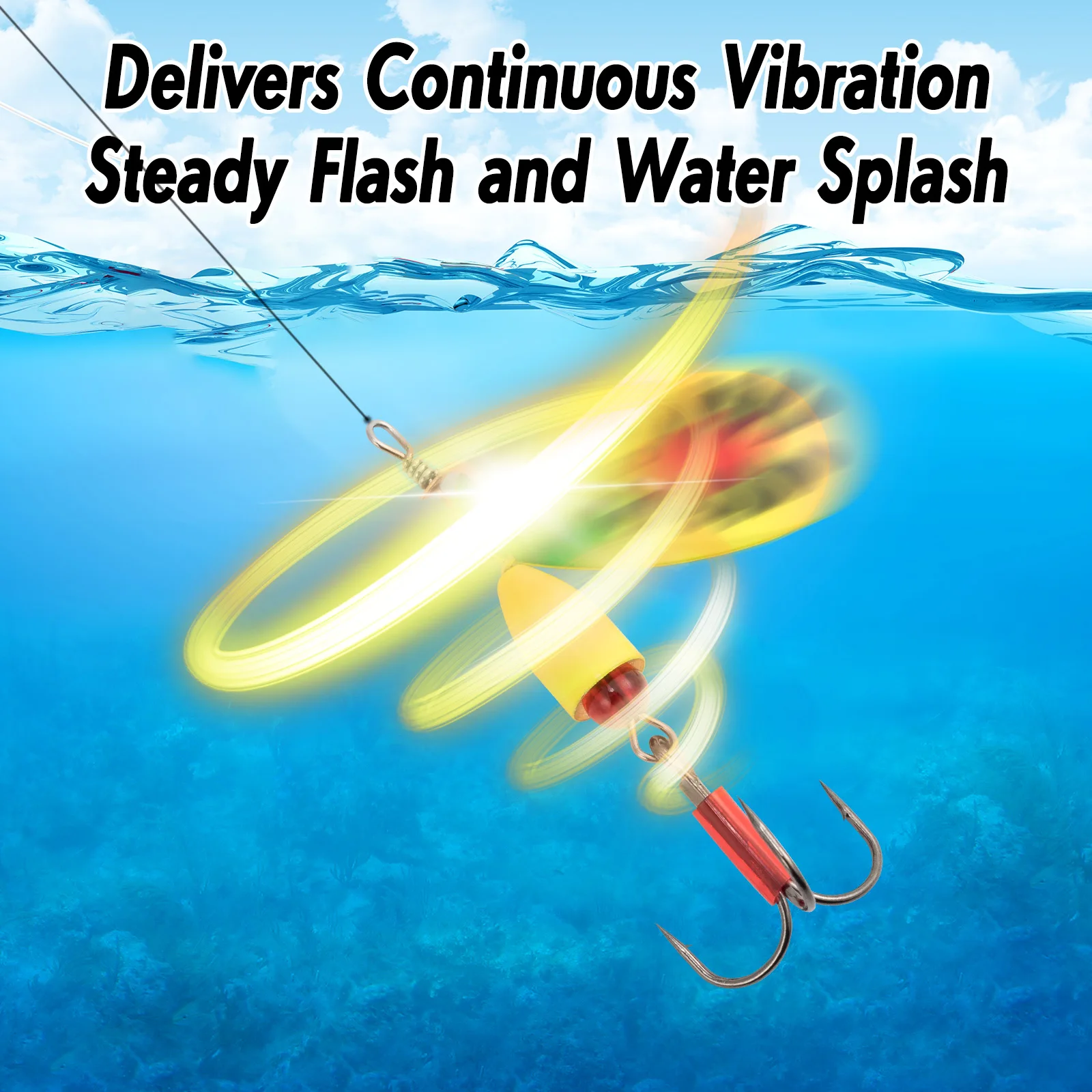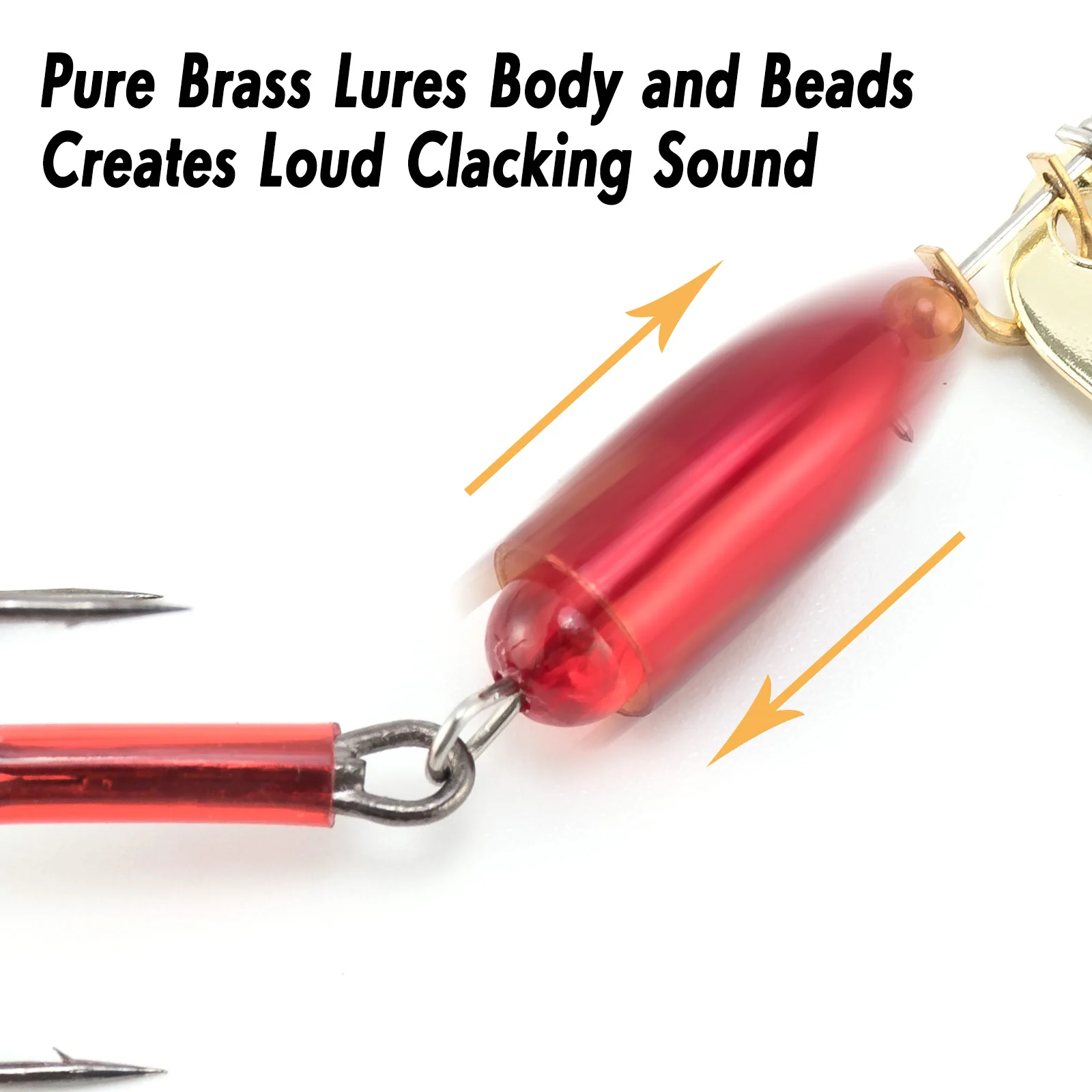 Las palas de indiana pueden girar 360° en el agua para producir salpicaduras y destellos de agua, mientras que otras piezas metálicas chocan para generar ruido y atraer a los peces.