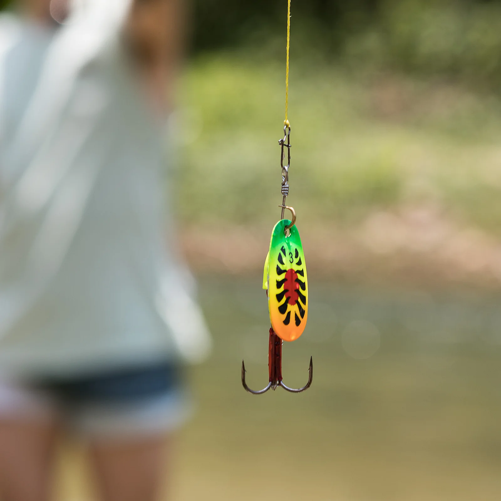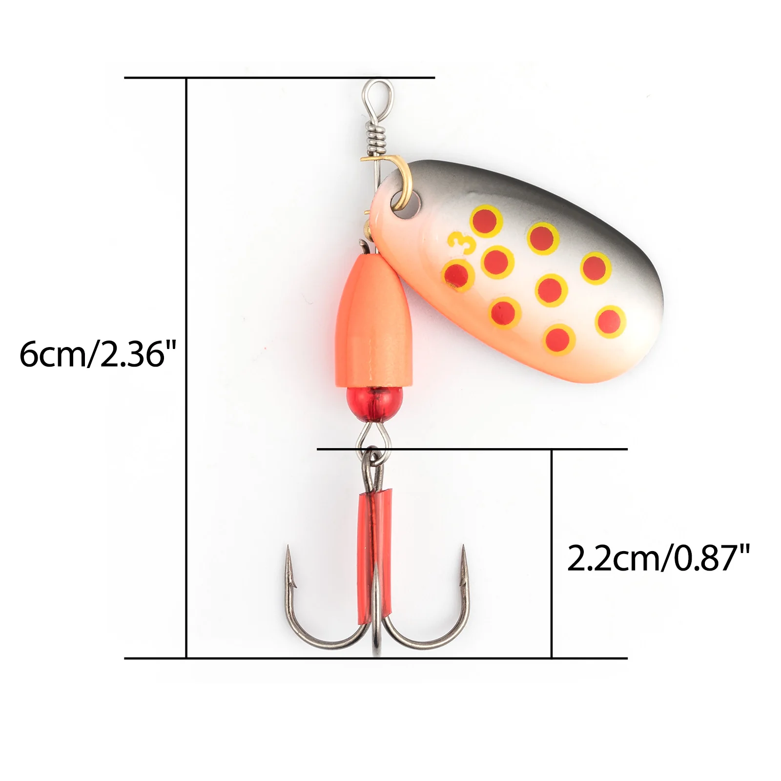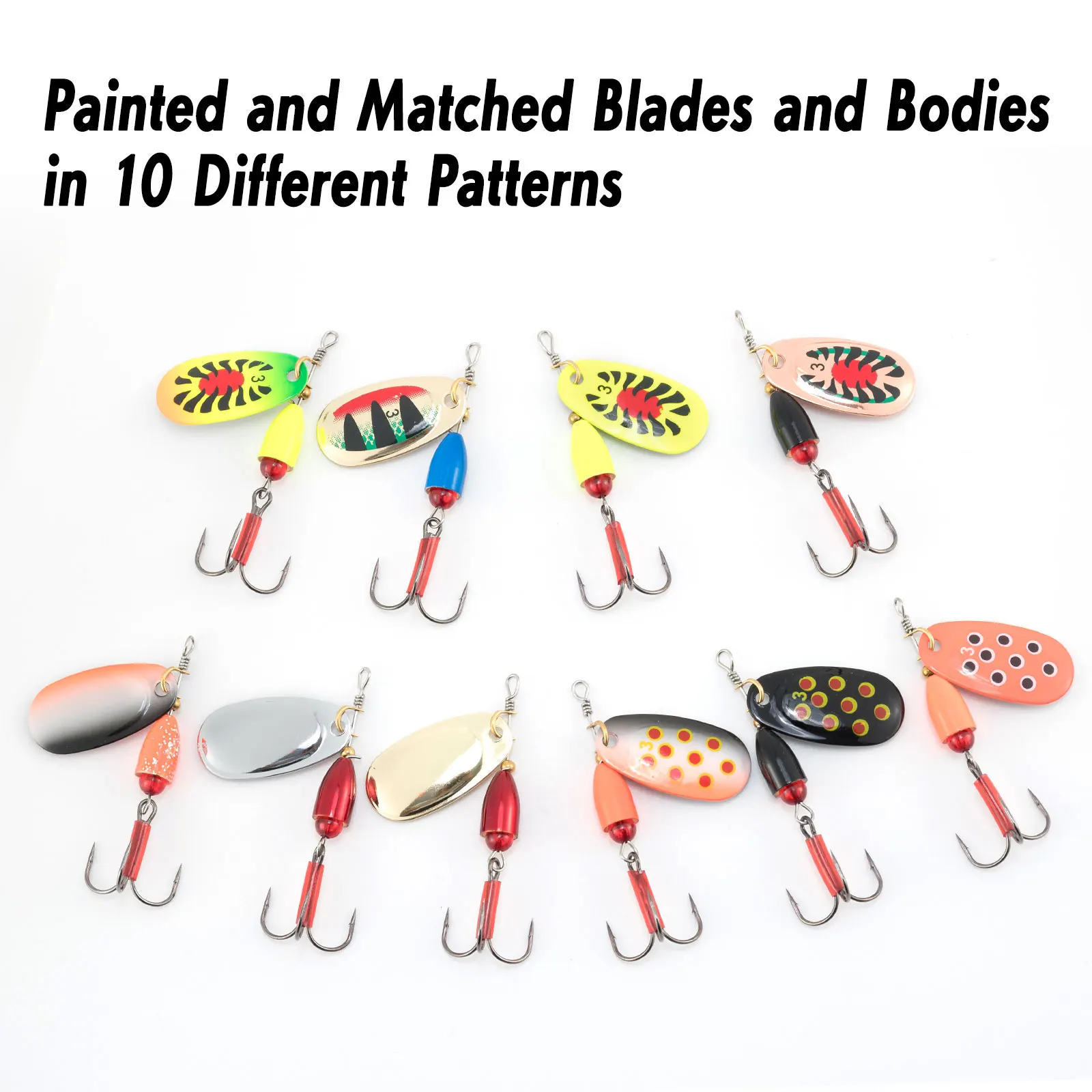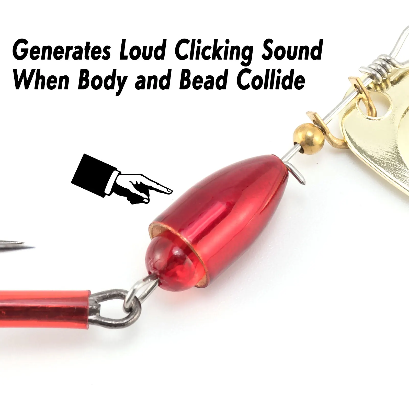 Hecho con componentes de alta calidad que incluyen eje de acero inoxidable que no es fácil de oxidar, cuerpo de señuelo con forma de campana de colores brillantes, cuchillas de Indiana pintadas y anzuelos afilados.