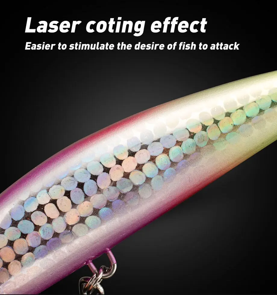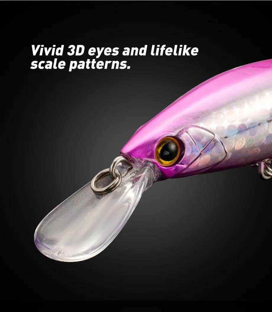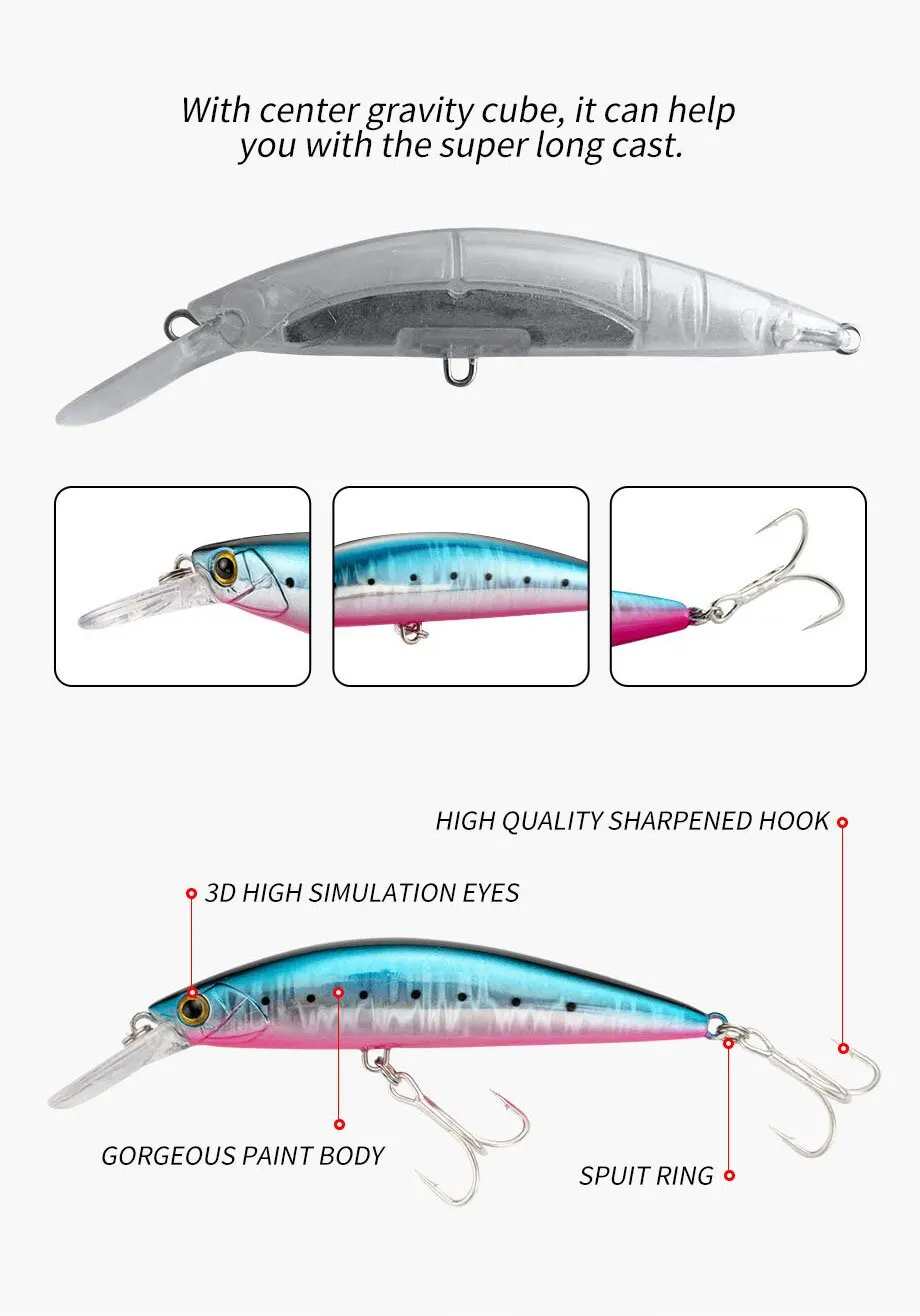 • Hundimiento Minnow :El diseño de hundimiento de este minnow le permite alcanzar niveles de agua más profundos, por lo que es una gran opción para los pescadores que se dirigen a los peces que nadan a diferentes profundidades.