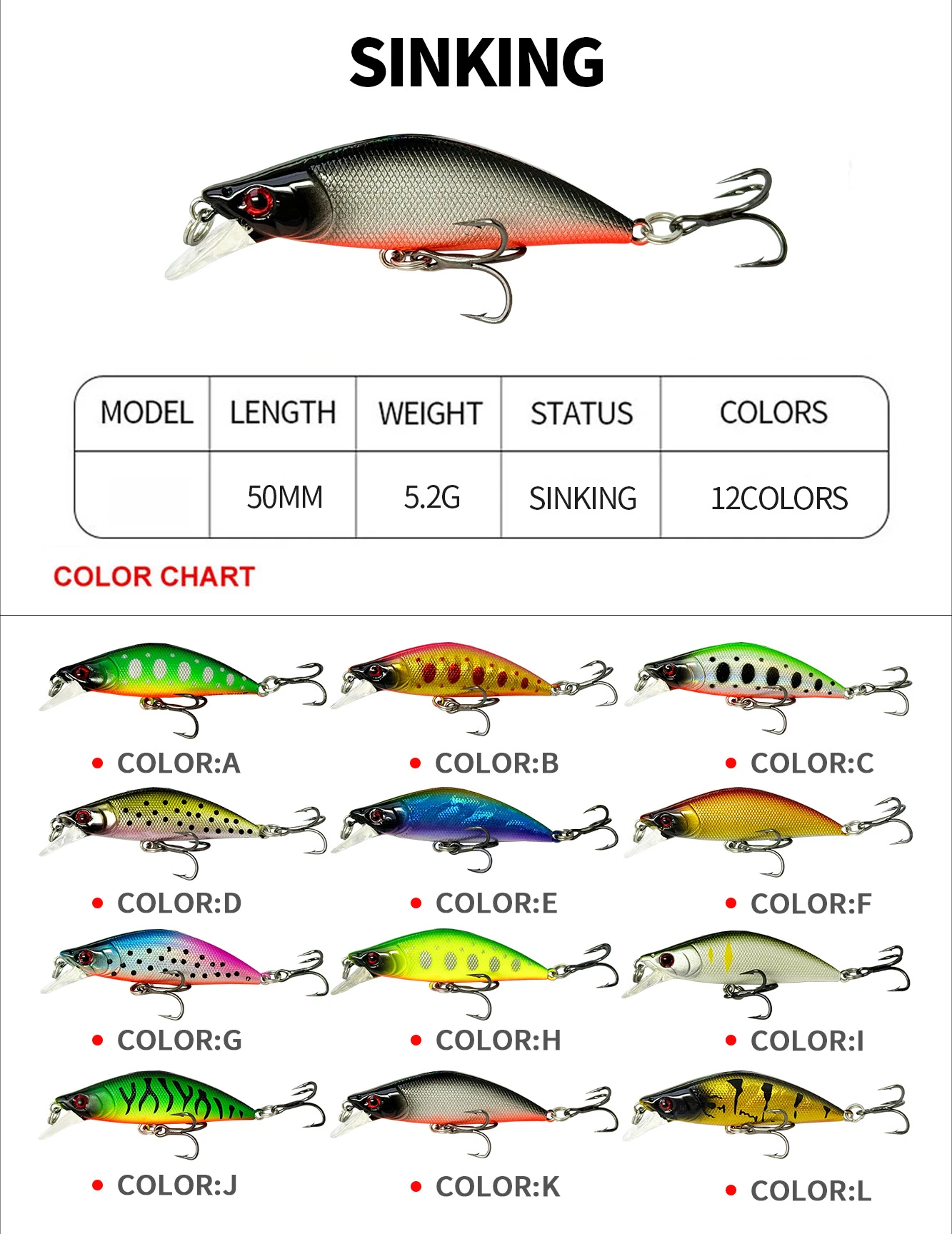 Señuelo de pesca Jerkbait de fundición larga, pececillo que se hunde, 50mm, 5,2G, aparejos de cebo Artificial para lubina de agua salada y tierra