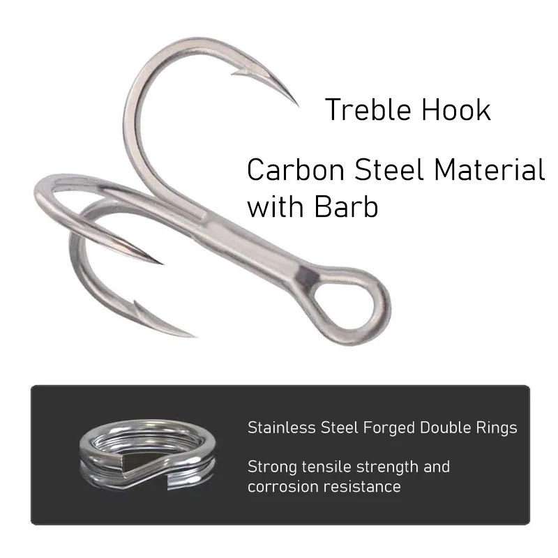 3. Anzuelo resistente y fuerte: la plantilla de cabeza de pez está equipada con un anzuelo triple de acero al carbono puntiagudo, resistente y duradero, que ayudará a agarrar y sujetar los peces firmemente durante la pelea.
