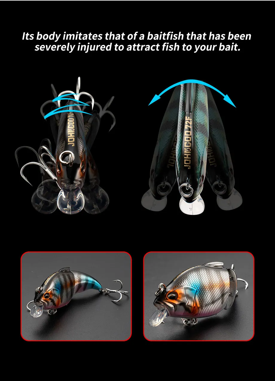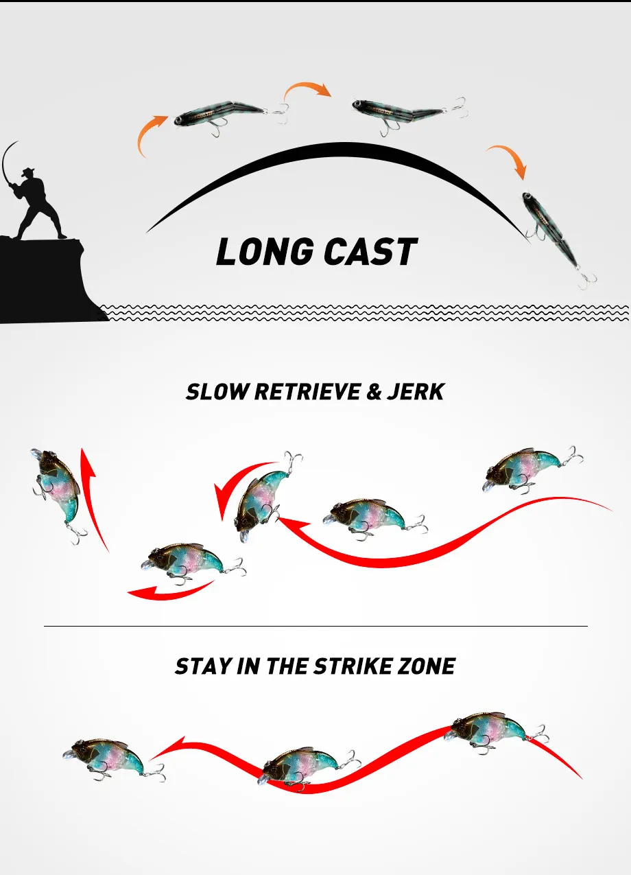 Los cebos utilizaron materiales ABS de alta calidad y costos láser 3D.Los cuerpos brillantes y los vívidos globos oculares simulados pueden confundir y provocar depredadores.