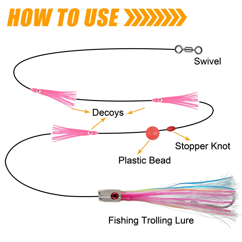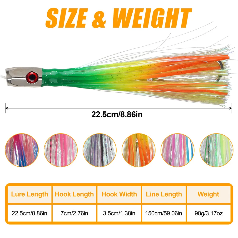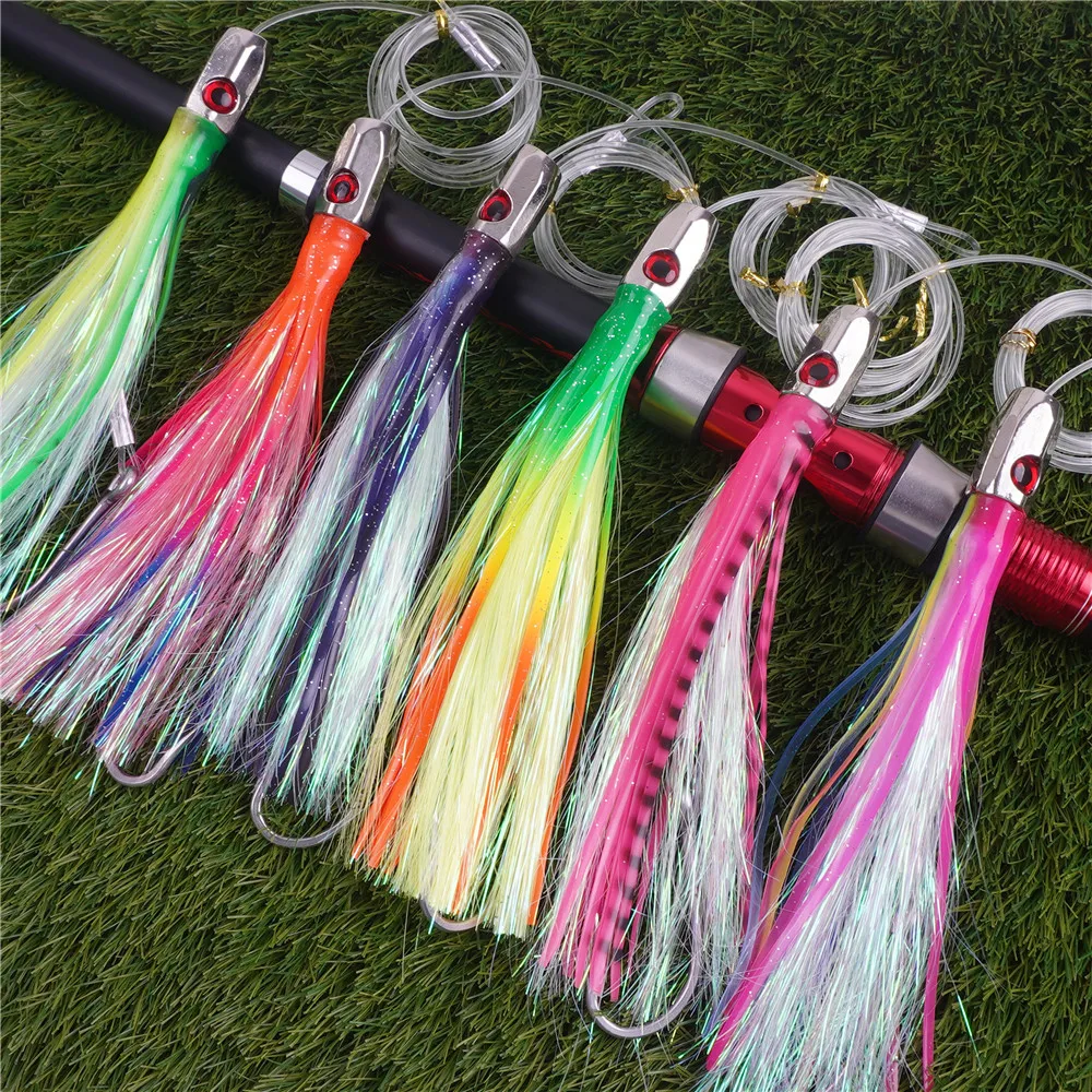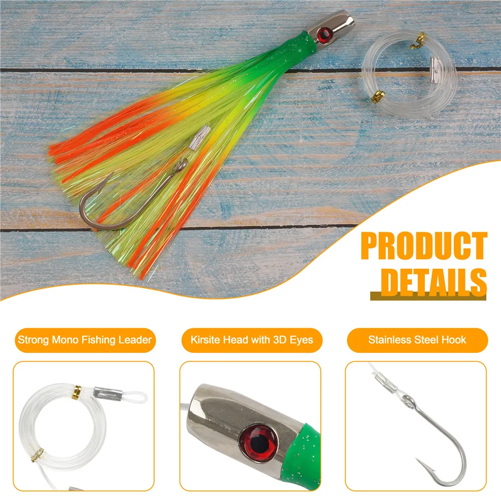 Material: señuelo de faldas de goma, anzuelos de pesca de acero inoxidable, línea de nailon, cabeza de plantilla de aleación de zinc