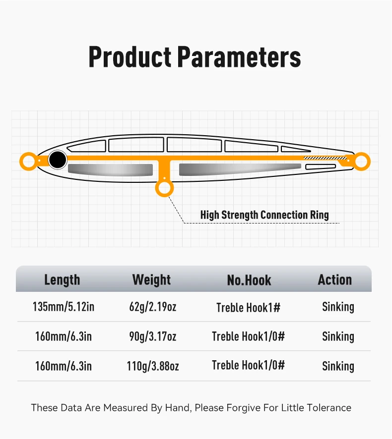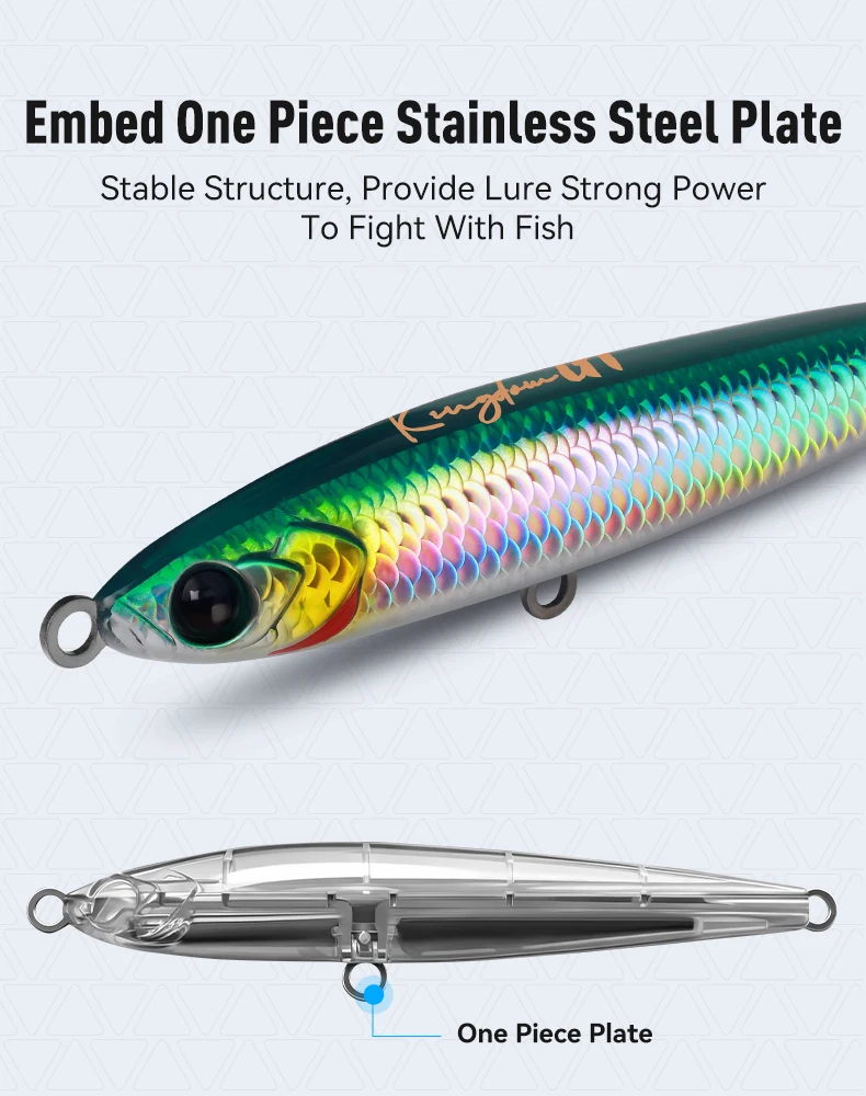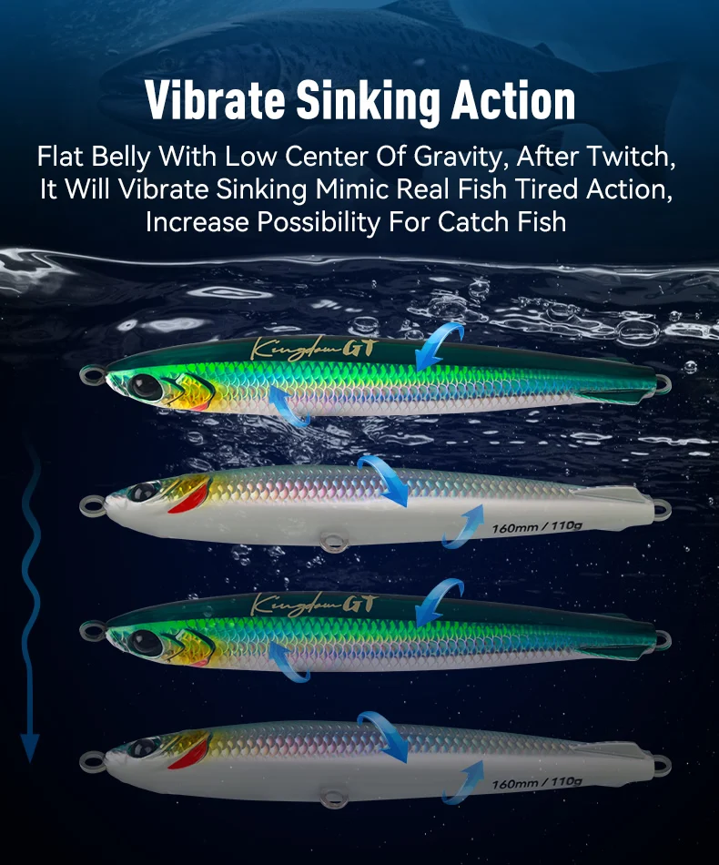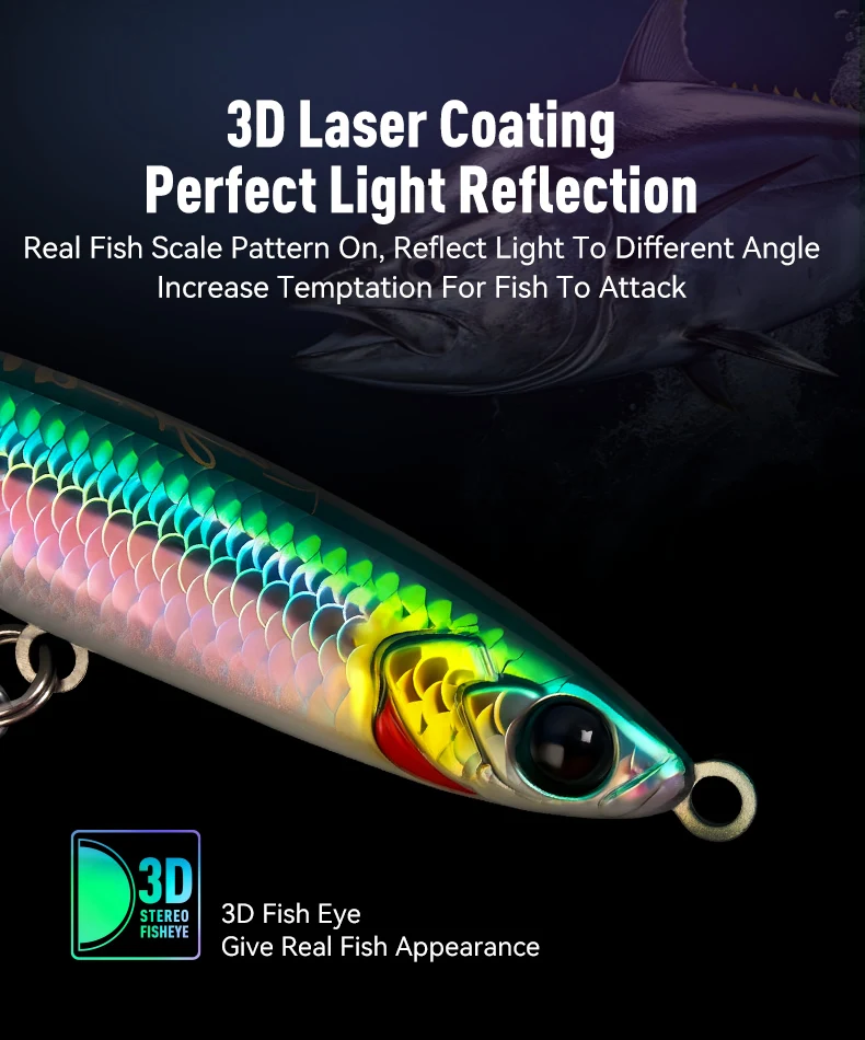 Un tamaño común de 160 mm y un peso robusto de 110 g permiten un lanzamiento perfecto a larga distancia, dirigido directamente al reír de los lugares de aguas profundas.[Recubrimiento iridiscente láser 3D, bomba con efecto de luz subacuática] 360° Textura realista de escamas de pez + diseño de ojo de pez 3D, ¡la refracción de la luz imita el movimiento de un pez real!