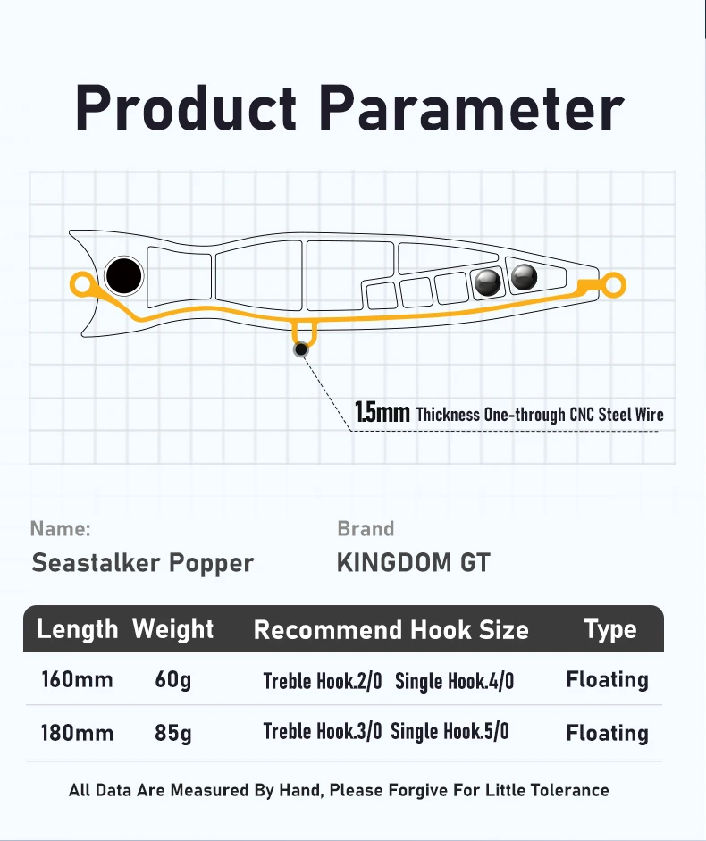 - Diseñado para potentes especies de agua salada como GT, 160 mm/180 mm de longitud y pesa 60 g/85 g, lanza largas distancias y resiste golpes fuertes.
